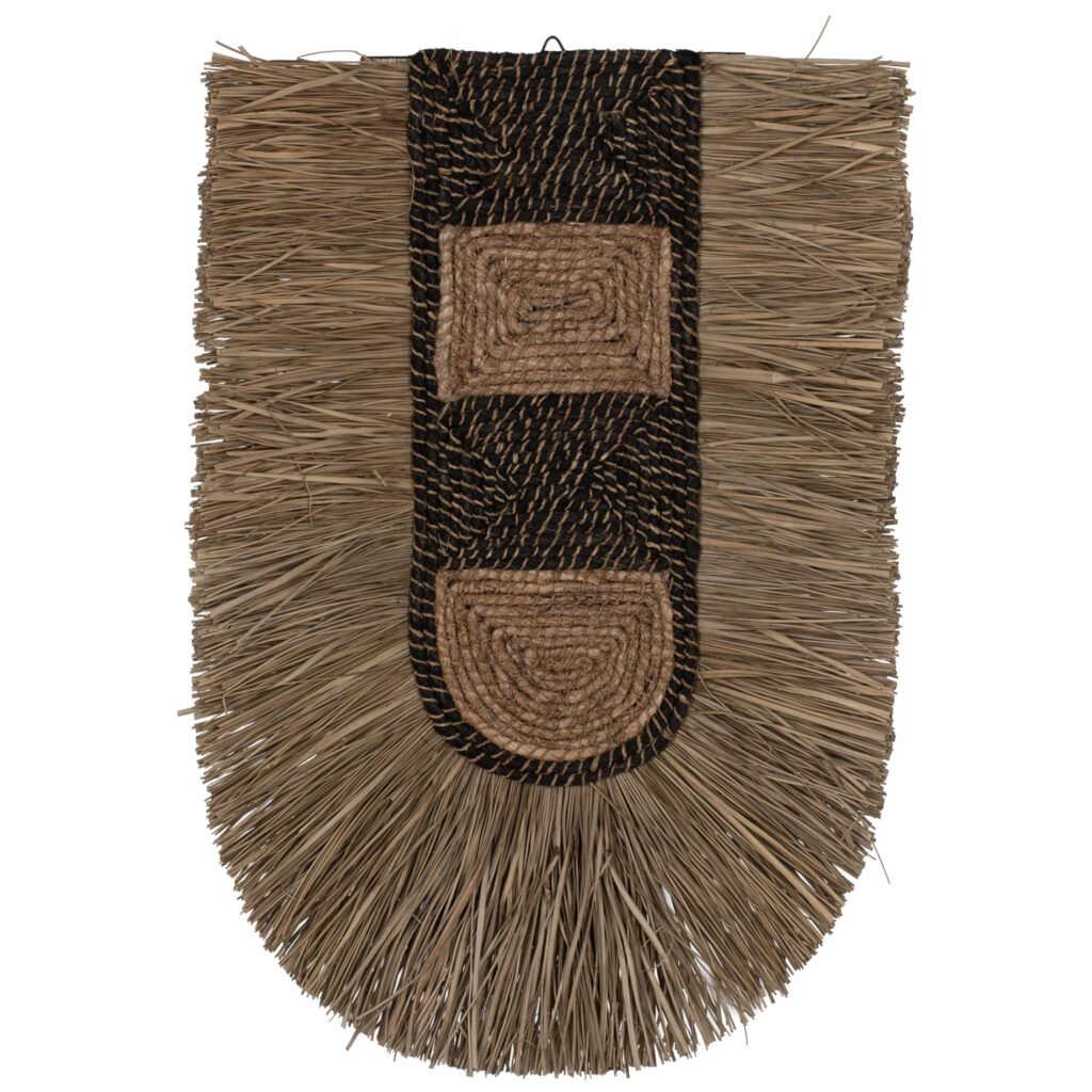 Το διακοσμητικό αυτό είναι κατασκευασμένο από κομμάτια καλαμιάς με ίνες από φλοιούς μπανάνας στο εμπρός μέρος.