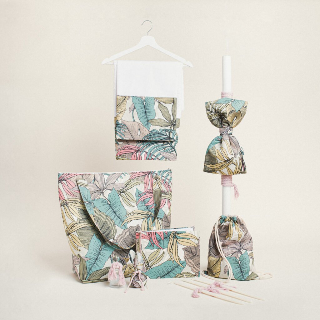 Ένα φωτεινό και δροσερό σετ βάπτισης με τροπικά σχέδια σε παστέλ αποχρώσεις, ιδανικό για μια χαρούμενη και καλοκαιρινή βάπτιση.