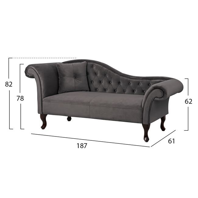 Το ανάκλινδρο με σχεδιασμό Chesterfield, καπιτονέ διακόσμηση, συνδυάζει στιλ και άνεση, ενώ η ταπετσαρία από βελούδινο ύφασμα υψηλής ποιότητας θα προσθέσει μια πινελιά πολυτέλειας στον εσωτερικό σας χώρο.