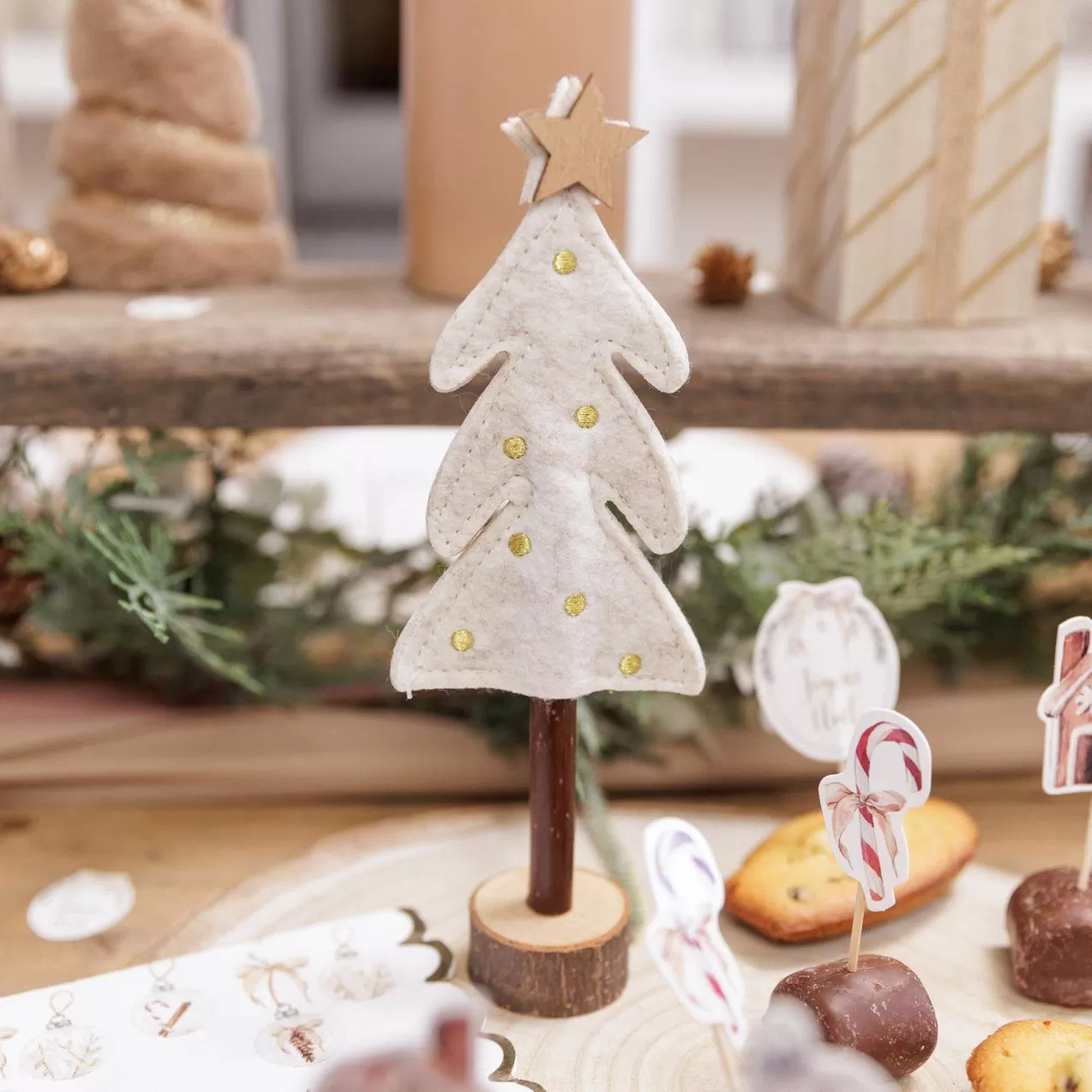 Beauty Home Δέντρο με Αστέρι σε Ξύλινη Βάση, Λευκή Τσόχα και Χρυσή Κεντητή Διακόσμηση 21 x 7,5 cm