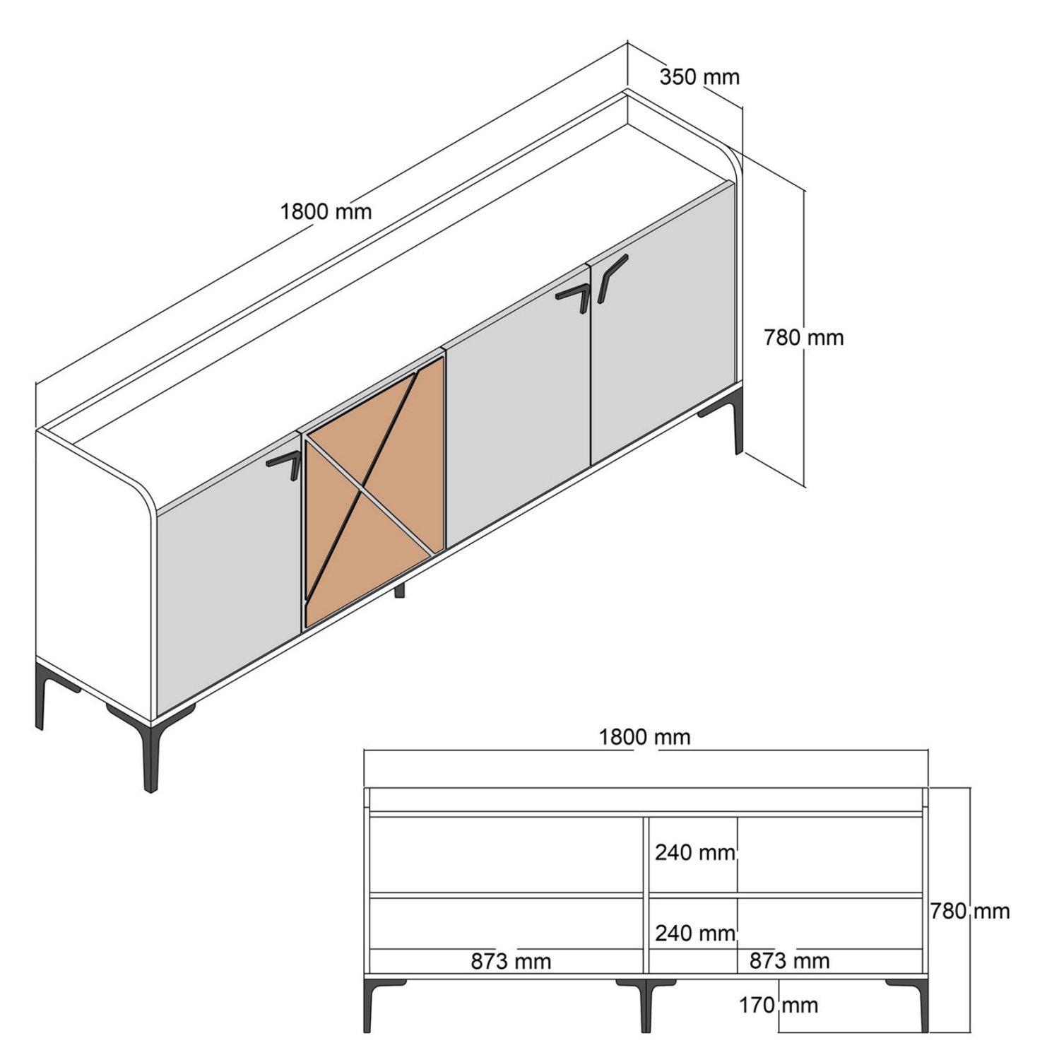 Ο μπουφές είναι κατασκευασμένος από μελαμίνη 18mm. Η μελαμίνη είναι είδος ξύλου σε μορφή μοριοσανίδας(panel). Ως υλικό είναι πολύ ανθεκτικό και με μεγάλη σκληρότητα. Άρα, πρόκειται για ένα συνθετικό υλικό με πολύ σκληρή επιφάνεια, με αποτέλεσμα να είναι πολύ ανθεκτική στις γρατζουνιές, στην τριβή και τους λεκέδες.
