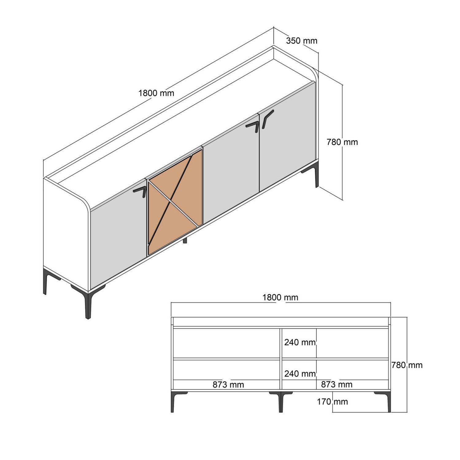 Ο μπουφές είναι κατασκευασμένος από μελαμίνη 18mm. Η μελαμίνη είναι είδος ξύλου σε μορφή μοριοσανίδας(panel). Ως υλικό είναι πολύ ανθεκτικό και με μεγάλη σκληρότητα. Άρα, πρόκειται για ένα συνθετικό υλικό με πολύ σκληρή επιφάνεια, με αποτέλεσμα να είναι πολύ ανθεκτική στις γρατζουνιές, στην τριβή και τους λεκέδες.