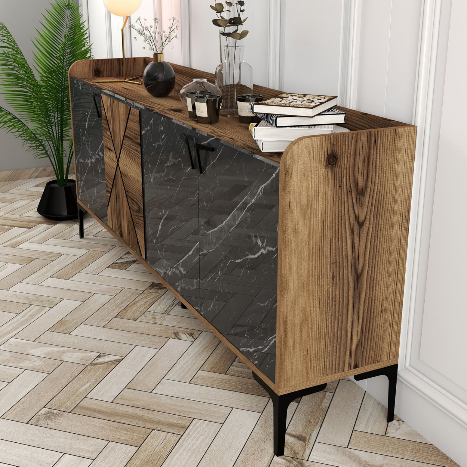 Ο μπουφές ΗΜ9433.03 είναι ένα επιβλητικό έπιπλο όπου κι αν τον τοποθετήσετε. Έχει ψηλά μαύρα μεταλλικά πόδια και δύο μεγάλα ντουλάπια που ανοίγουν με διπλές πόρτες με μεταλλικά μαύρα χερούλια. Το μήκος του εξασφαλίζει ότι η επιφάνεια του είναι μεγάλη και αρκετή για τοποθέτηση πολλών αντικειμένων. Το χρώμα όλης της κατασκευής είναι καρυδί, ενώ οι 3 από τις 4 πόρτες έχουν όψη ΜΑΥΡΟΥ ΜΑΡΜΑΡΟΥ. Ο μπουφές αυτός θα σας ενθουσιάσει! Τι είναι όμως ο μπουφές; Ο μπουφές είναι ένα άκρως πρακτικό έπιπλο, αφού στους αποθηκευτικούς του χώρους μπορούμε να βάλουμε από σερβίτσια πιάτων και ποτήρια, μέχρι κεριά και διάφορα άλλα χρηστικά αντικείμενα που έχουμε στο σπίτι μας, ώστε να είναι τακτοποιημένα και να μη δημιουργούν ακαταστασία στο χώρο.