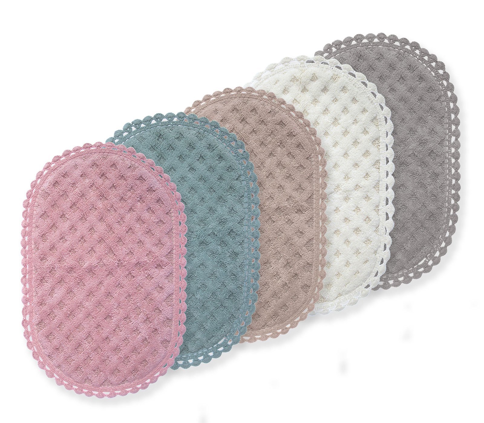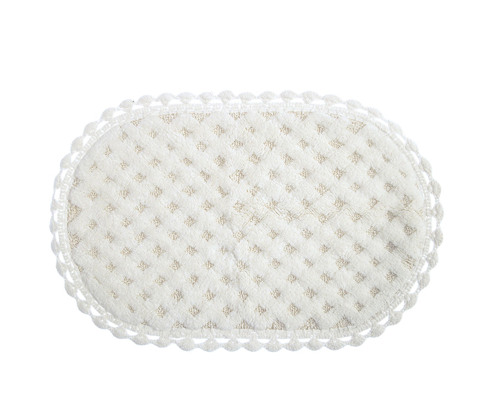 Χαλάκι μπάνιου οβάλ με δαντέλα περιμετρικά. Έχει διάσταση 55x85cm και το βάρος του είναι 1700gr/m2 .