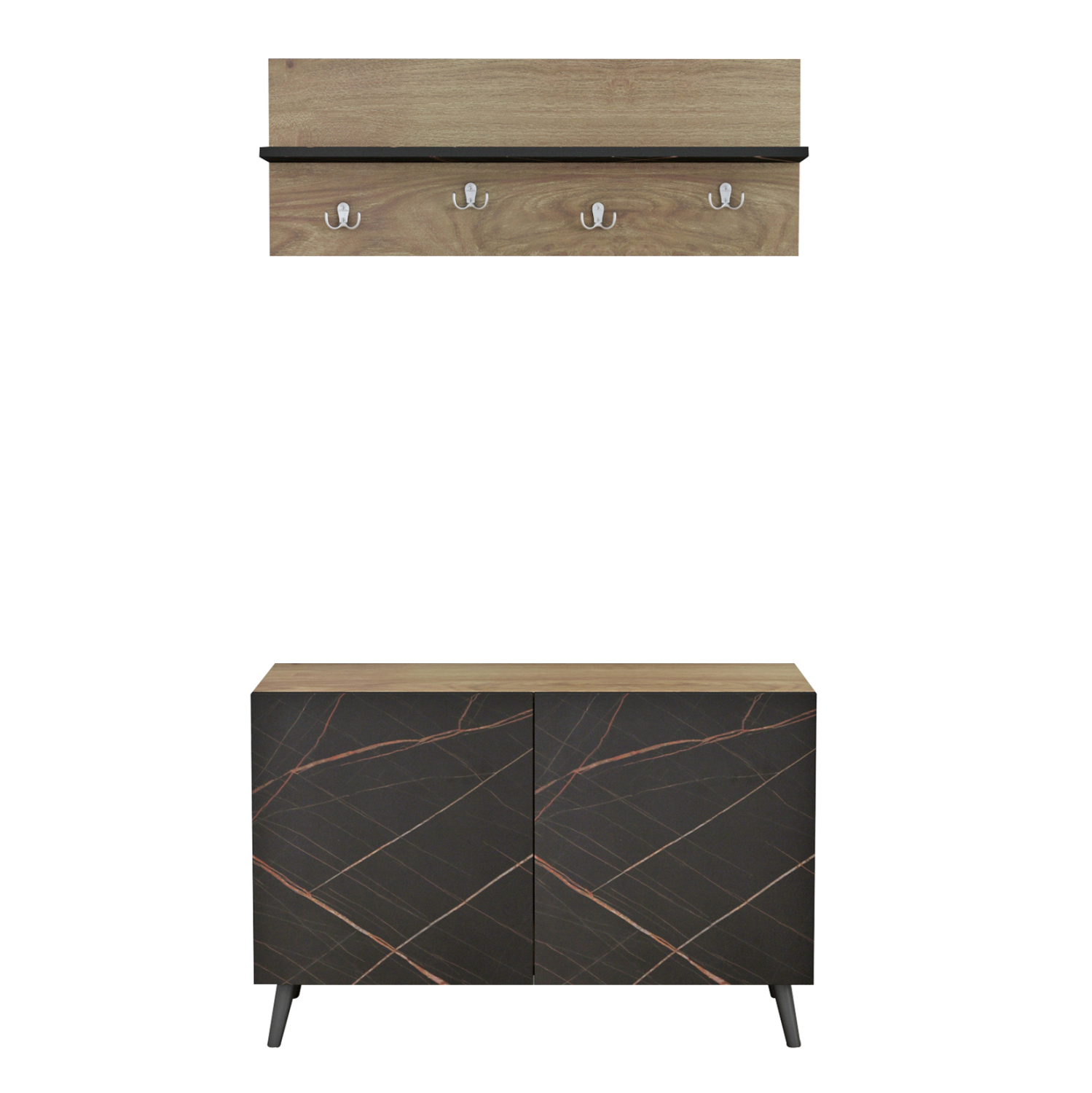 Το σετ εισόδου DELPHINE αποτελείται από μια παπουτσοθήκη-ντουλάπι με ψηλά πόδια με δύο πόρτες και ενιαίο χώρο αποθήκευσης και μια κρεμάστρα τοίχου με ράφι. Η κρεμάστρα διαθέτει 4 διπλά σημεία κρέμασης ενώ το ράφι προσδίδει επιπλέον πρακτικότητα στο σετ. Ένα σετ μελαμίνης με βολικές διαστάσεις σε χρώμα ΦΥΣΙΚΟ ΞΥΛΟΥ-ΜΑΥΡΟ ΜΑΡΜΑΡΟ που θα σας ενθουσιάσει, μιας και σας επιτρέπει να διατηρείτε τον χώρο υποδοχής σας οργανωμένο και τακτοποιημένο.