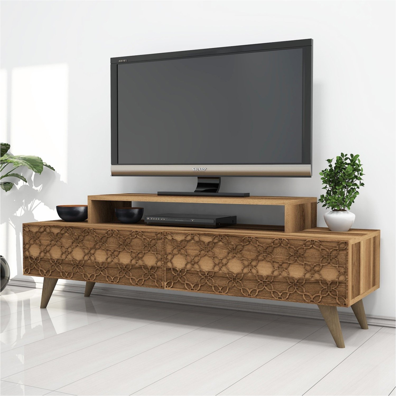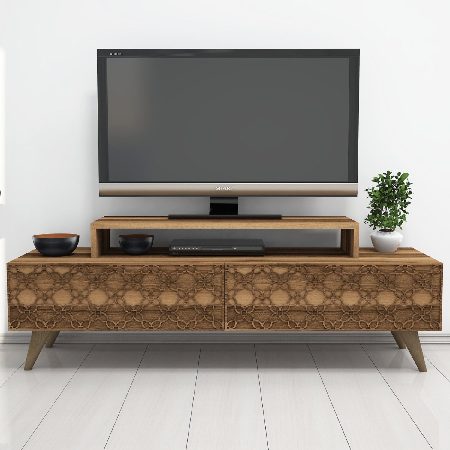 Το ΗΜ9510.01 είναι ένα μοντέρνο και λειτουργικό έπιπλο τηλεόρασης από μελαμίνη σε ΚΑΡΥΔΙ χρώμα, που θα ομορφύνει το σαλόνι σας! Είναι μακρύ και διαθέτει δύο ισομεγέθη ντουλάπια ως κύριο χώρο αποθήκευσης ή τοποθέτησης αντικειμένων. Η εμπρός όψη των ντουλαπιών, που ανοίγουν κατακόρυφα, είναι διακοσμημένη με μηχανικά κατασκευασμένα (CNC Relief) και όμορφα συμμετρικά σχέδια. Επάνω στην κύρια επιφάνεια υπάρχει ακόμα μια μικρότερη βάση στην οποία τοποθετείται η τηλεόραση ενώ από κάτω υπάρχει χώρος για τοποθέτηση κι άλλων συσκευών. Τα πόδια είναι σχετικά ψηλά. Οι διαστάσεις του επίπλου είναι κατάλληλες για όλες τις τηλεοράσεις εάν θέλετε η τηλεόρασή σας να στηρίζεται σε βάση. Πρόκειται για μια κομψή πρόταση για το σαλόνι σας!
