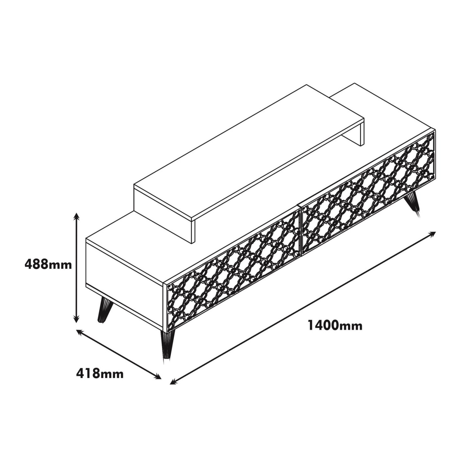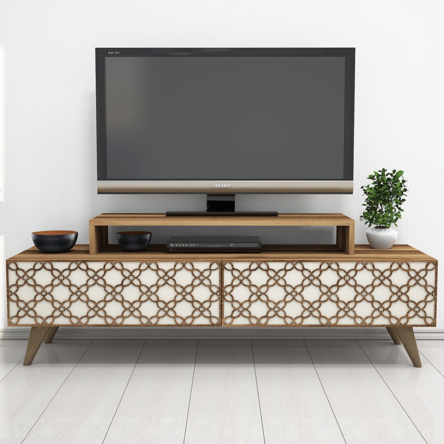 Το ΗΜ9510.03 είναι ένα μοντέρνο και λειτουργικό έπιπλο τηλεόρασης από μελαμίνη σε ΚΑΡΥΔΙ ΚΑΙ ΚΡΕΜ χρώμα, που θα ομορφύνει το σαλόνι σας! Είναι μακρύ και διαθέτει δύο ισομεγέθη ντουλάπια ως κύριο χώρο αποθήκευσης ή τοποθέτησης αντικειμένων. Η εμπρός όψη των ντουλαπιών, που ανοίγουν κατακόρυφα, είναι διακοσμημένη με μηχανικά κατασκευασμένα (CNC Relief) και όμορφα συμμετρικά σχέδια. Επάνω στην κύρια επιφάνεια υπάρχει ακόμα μια μικρότερη βάση στην οποία τοποθετείται η τηλεόραση ενώ από κάτω υπάρχει χώρος για τοποθέτηση κι άλλων συσκευών. Τα πόδια είναι σχετικά ψηλά. Οι διαστάσεις του επίπλου είναι κατάλληλες για όλες τις τηλεοράσεις εάν θέλετε η τηλεόρασή σας να στηρίζεται σε βάση. Πρόκειται για μια κομψή πρόταση για το σαλόνι σας!
