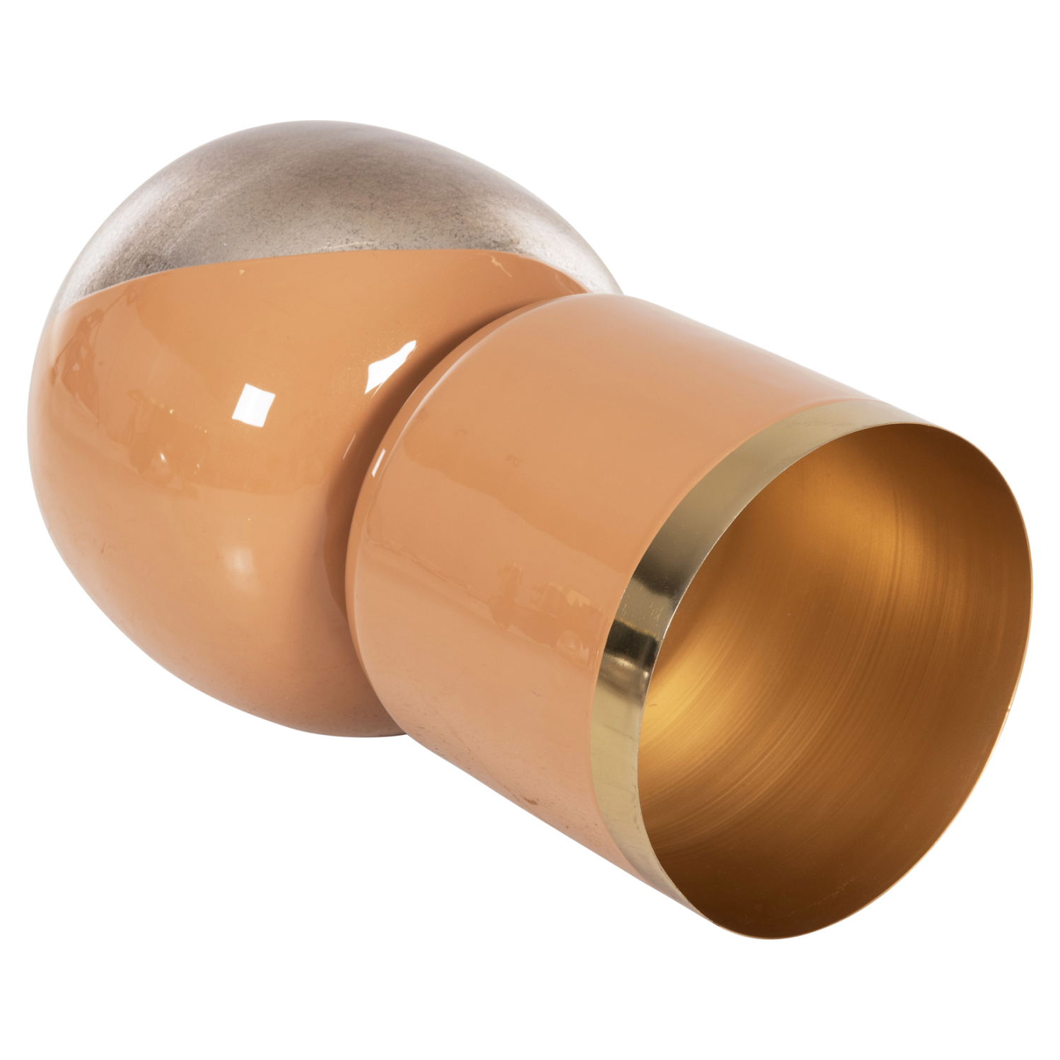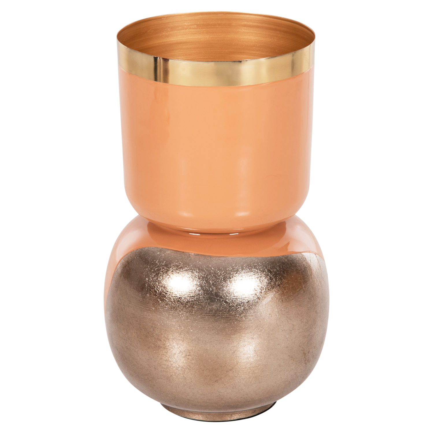 Το διακοσμητικό επιτραπέζιο βάζο LINGON είναι εξολοκλήρου μεταλλικό και αποτελείται από δύο μέρη. Την σχεδόν σφαιρική βάση και το βάζο με το μεγάλο στόμιο κολλημένο επάνω στην βάση. Το χρώμα του είναι ΣΟΜΟΝ με ΧΡΥΣΟ περιμετρικά στο στόμιο, ενώ η βάση είναι ΣΟΜΟΝ με brushed ΑΣΗΜΙ θολό χρώμα. Αυτό το βάζο θα ομορφύνει κάθε χώρο είτε στο σπίτι είτε στον επαγγελματικό σας χώρο.