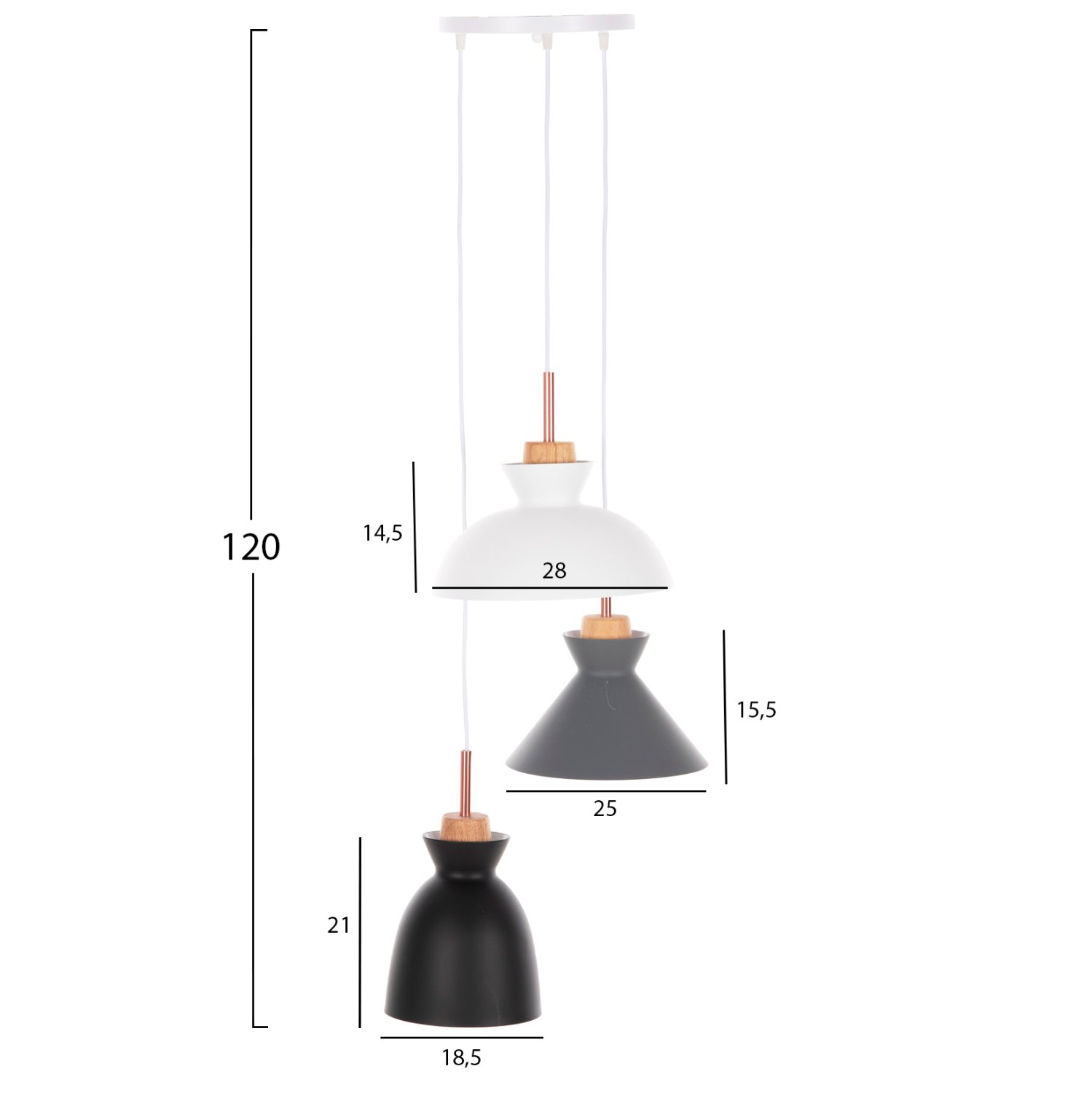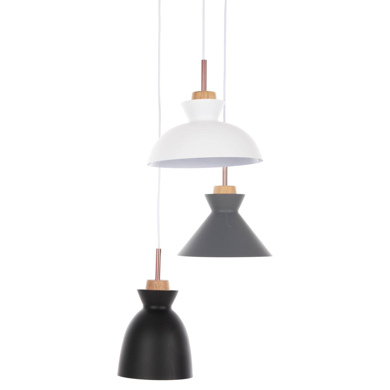 Ανακαλύψτε το όμορφο 3-φωτο φωτιστικό οροφής HM4142. Ένα φωτιστικό που θα συμπληρώσει την διακόσμηση του σαλονιού, χάρη στα 3 καπέλα με διαφορετικό σχήμα και διαφορετικό χρώμα η κάθε μια. Τα 3 χρώματα (γκρι-λευκό-μαύρο) συνοδεύονται με την λεπτομέρεια από ξύλο, από το οποίο κρέμονται τα καπέλα και φτάνει μέχρι το ντουί βιδώματος της λάμπας.