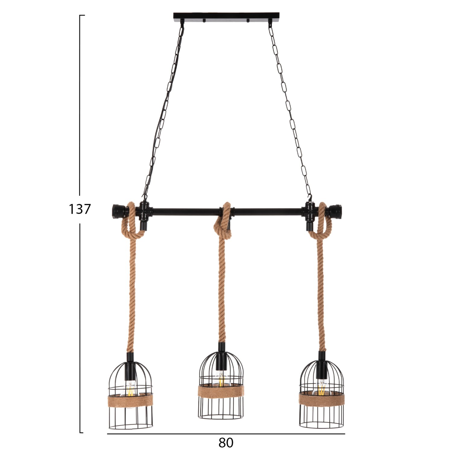 Αφήστε το φως να απλωθεί στον χώρο με ένα πρωτότυπο και φινετσάτο κρεμαστό οροφής, ολοκληρώνοντας την διακόσμησή σας. Το 3-φωτο αυτό, κρέμεται από μια μεταλλική βάση στην οροφή με αλυσίδες, οι οποίες κρατάνε μια μαύρη μεταλλική σωλήνα. Από αυτή την σωλήνα κρέμονται με σχοινί οι 3 λάμπες σε όμορφα καπελάκια.