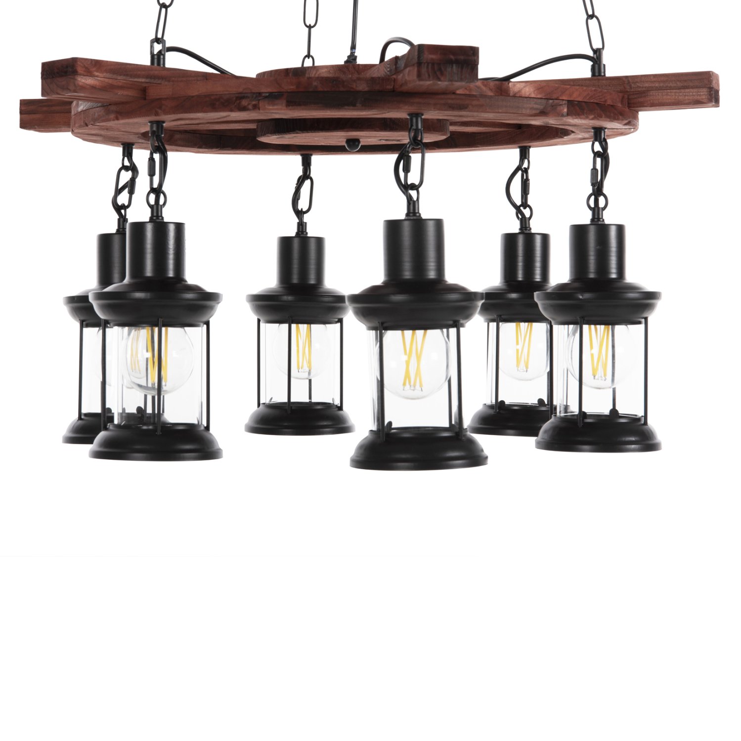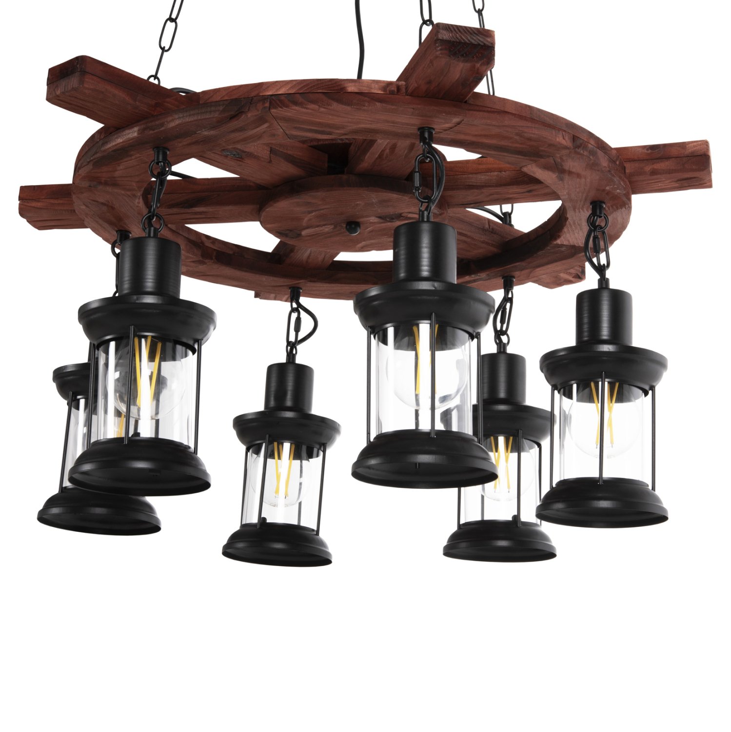Ανακαλύψτε το εντυπωσιακό 6-φωτο φωτιστικό οροφής HM4116. Ένα φωτιστικό που θα αποτελέσει το κέντρο του ενδιαφέροντος χάρη στο εντυπωσιακό και εμπνευσμένο του design. Τα 6 φαναράκια που περιέχουν τους λαμπτήρες κρέμονται από μια ξύλινη τιμονιέρα πλοίου (πηδάλιο), η οποία με την σειρά της κρέμεται από την οροφή με αλυσίδες.