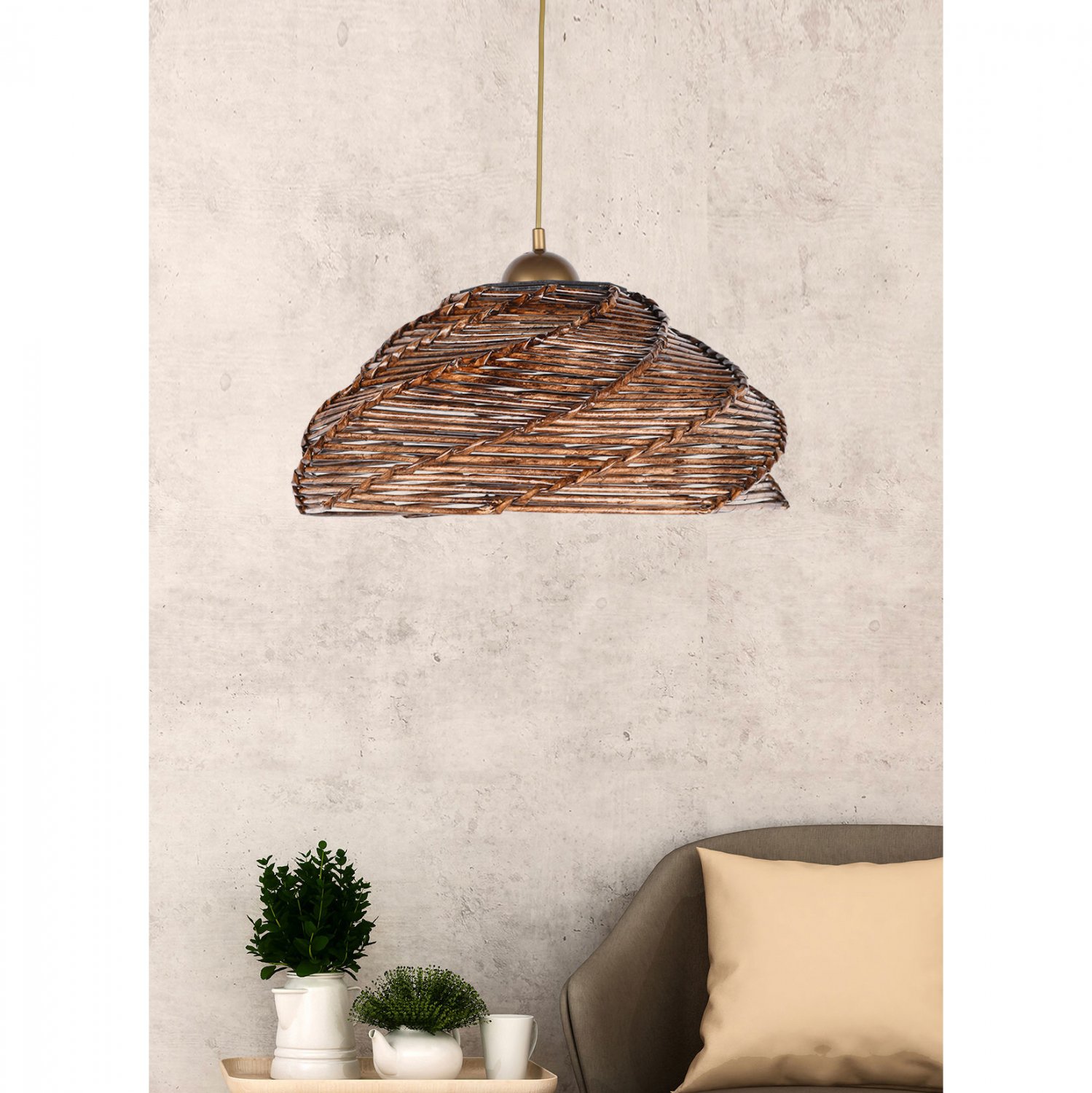 Μοντέρνο κρεμαστό φωτιστικό οροφής, κατασκευασμένο από ξύλινο σκελετό και επενδυμένο από bamboo υλικό σε καρυδί απόχρωση.