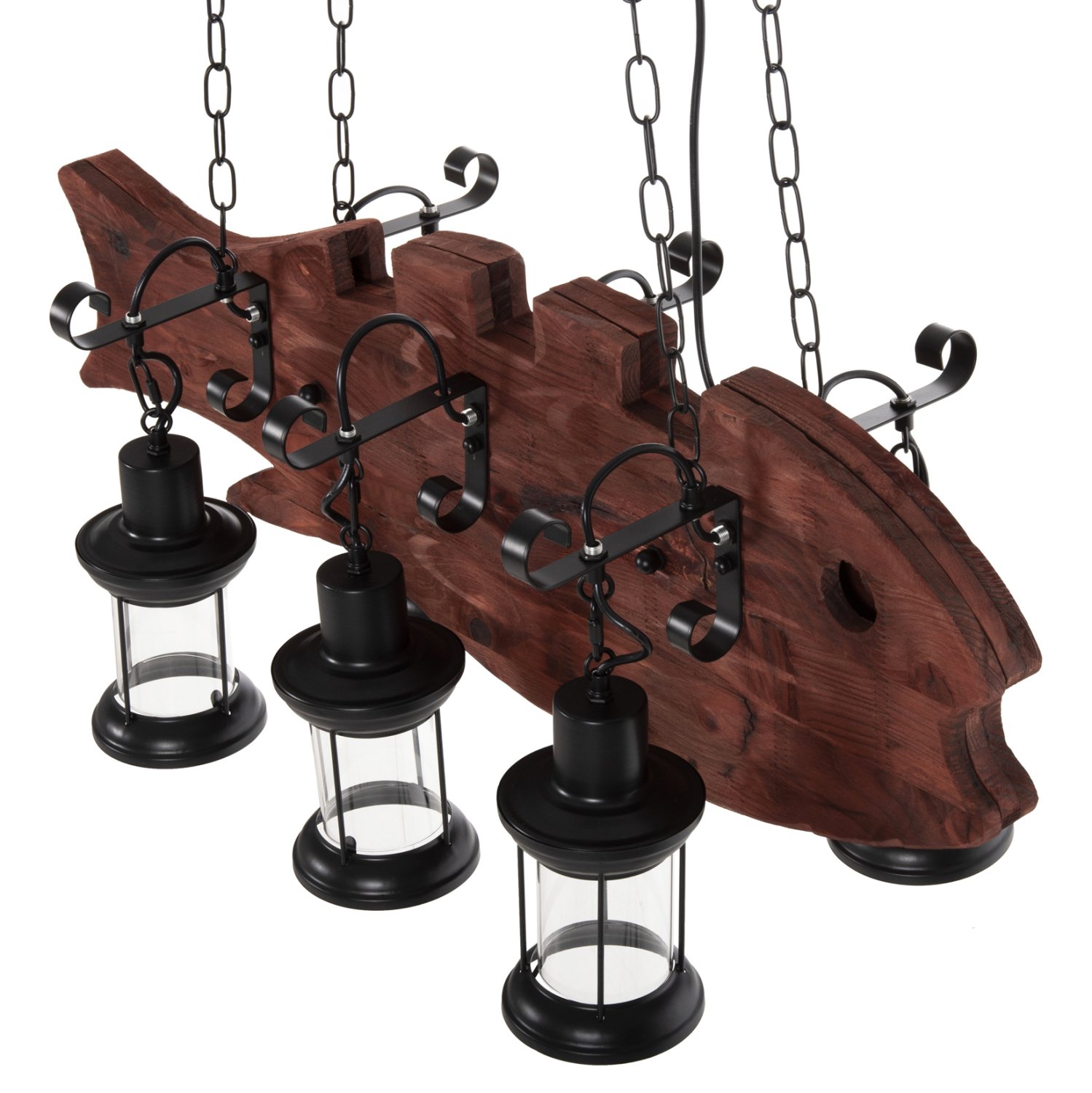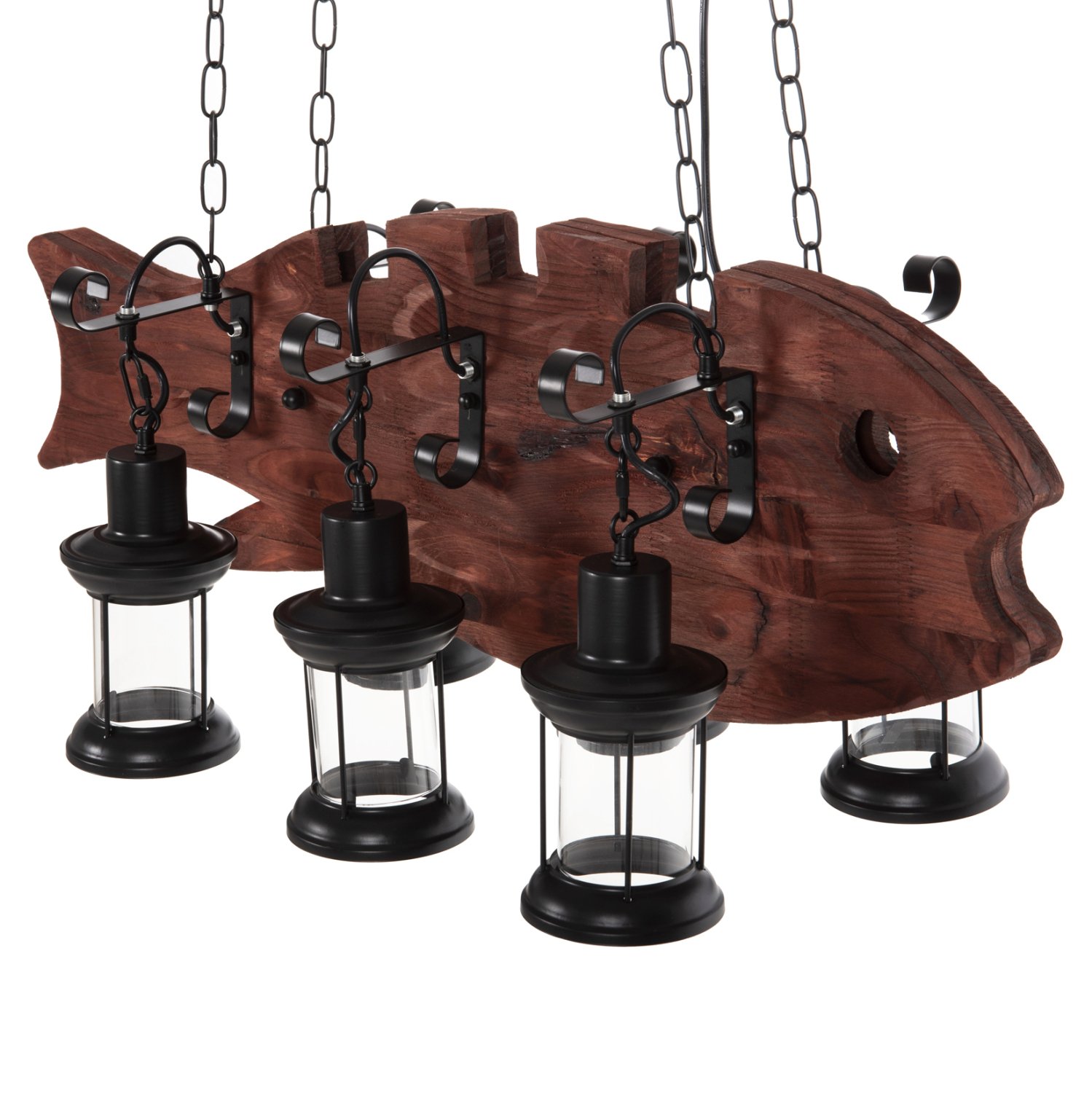 Ανακαλύψτε το εντυπωσιακό 6-φωτο φωτιστικό οροφής HM4118. Ένα φωτιστικό που θα αποτελέσει το κέντρο του ενδιαφέροντος χάρη στο εντυπωσιακό και εμπνευσμένο του design. Τα 6 φαναράκια που περιέχουν τους λαμπτήρες κρέμονται με όμορφες μεταλλικές κρεμάστρες από μια ξύλινη πλάκα με την μορφή ΨΑΡΙΟΥ, η οποία με την σειρά της κρέμεται από την οροφή με αλυσίδες.