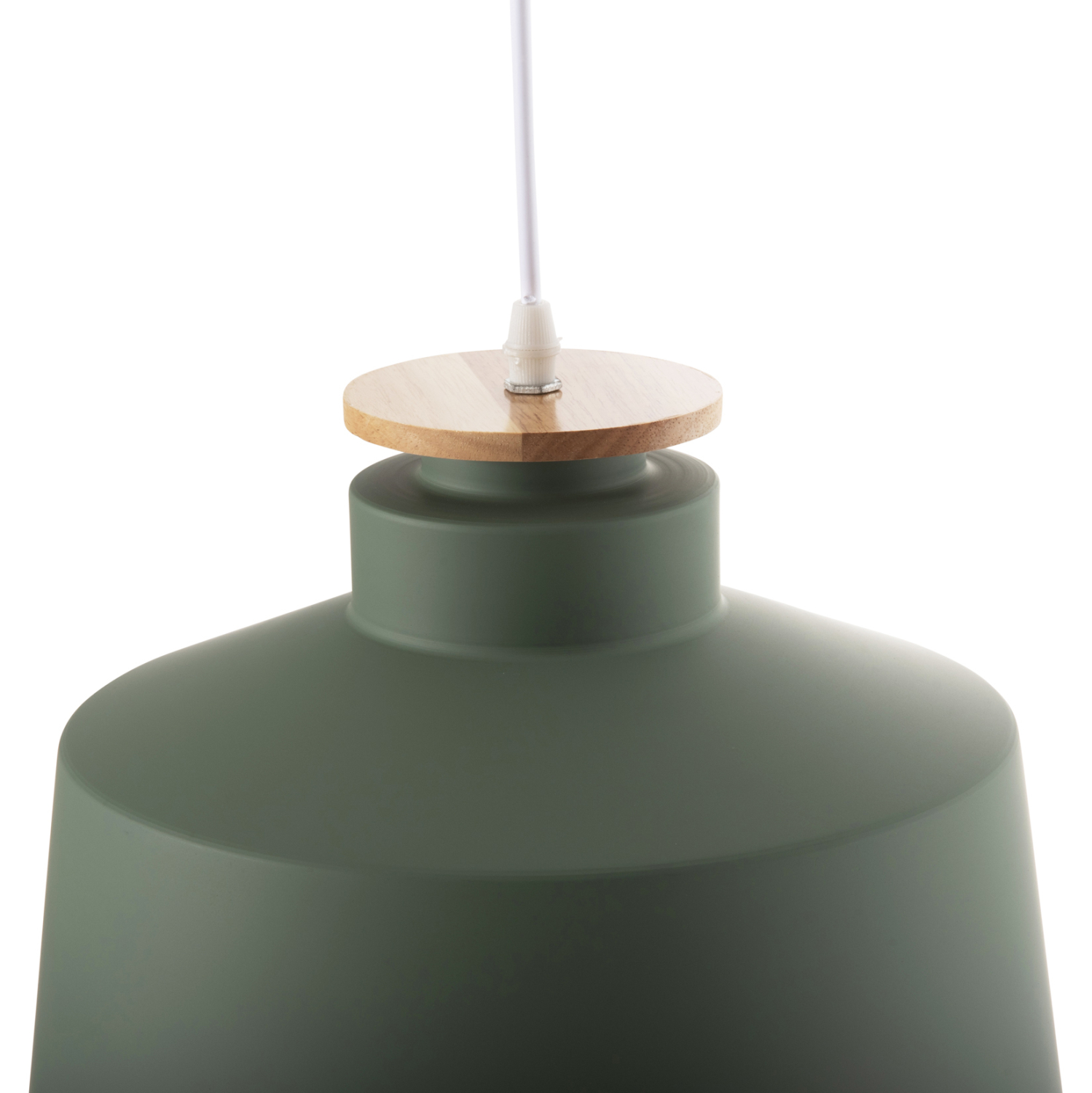 Ανακαλύψτε αυτό το νέο μας κρεμαστό φωτιστικό οροφής και ολοκληρώστε την διακόσμησή σας. Πρόκειται για ένα φωτιστικό με ΠΡΑΣΙΝΟ καπέλο ΑΛΟΥΜΙΝΙΟΥ σε σχήμα καμπάνας με λεπτομέρεια ξύλου στην κορυφή του φωτιστικού. Αισθητικά, ολοκληρώνεται με το λευκό καλώδιο κρέμασης και την λευκή βάση οροφής, και αποτελεί την τελευταία τάση στα φωτιστικά οροφής.