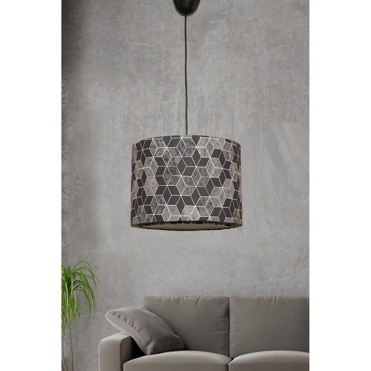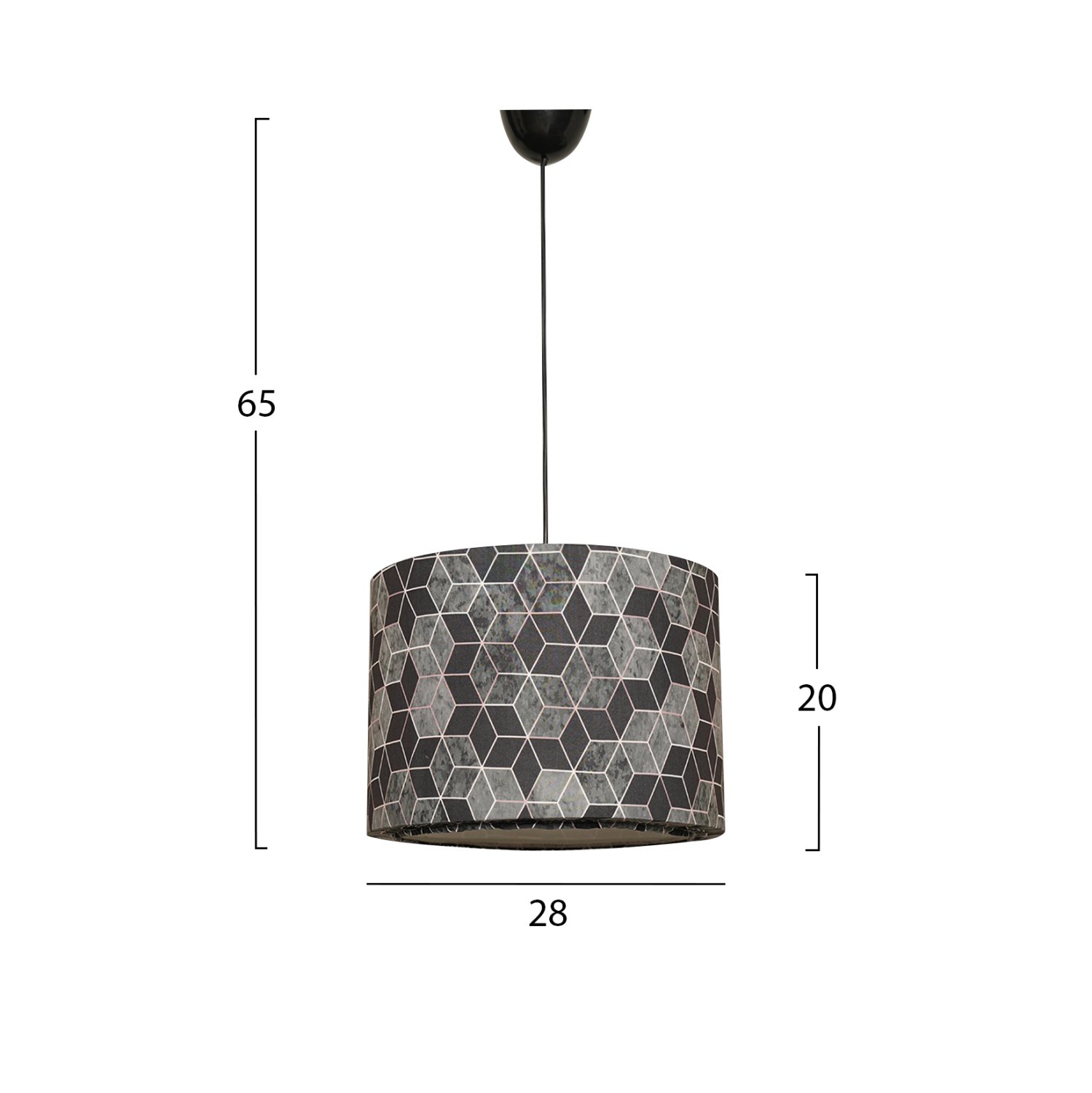 Μοντέρνο κρεμαστό φωτιστικό οροφής, κατασκευασμένο από μεταλλικό σκελετό και επενδυμένο από ύφασμα με γεωμετρικό μοτίβο σε μαύρη και γκρι απόχρωση.