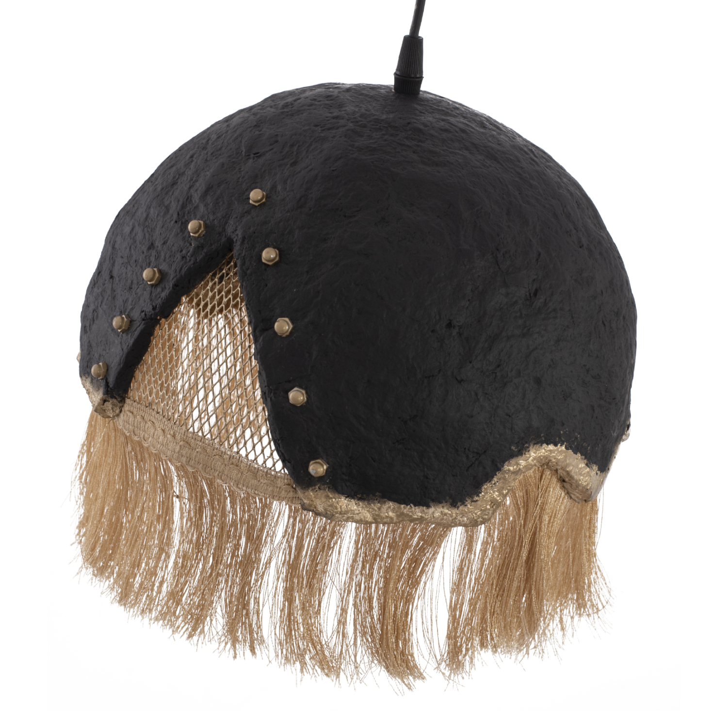 Hm7693.01-κρεμαστό φωτιστικό —-Αφήστε το φως να απλωθεί στον χώρο με ένα πρωτότυπο μονόφωτο οροφής, ολοκληρώνοντας την διακόσμησή σας. Το «καπέλο» του φωτιστικού αποτελείται από ένα σφαιρικό κομμάτι σε ιδιαίτερο ημισφαιρικό σχήμα και είναι η επιτομή του μοντέρνου design. Η διαφορετική «πινελιά» αυτού του κρεμαστού μονόφωτου είναι το χρυσό μεταλλικό πλέγμα στο εσωτερικό μέρος και τα μπεζ κρόσια που ολοκληρώνουν αισθητικά αυτό το πολύ ιδιαίτερο φωτιστικό.