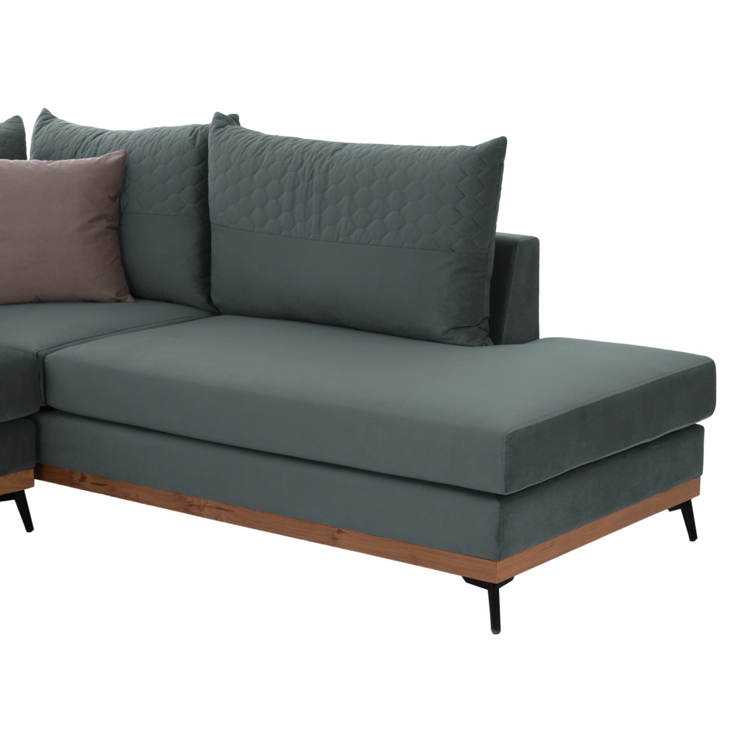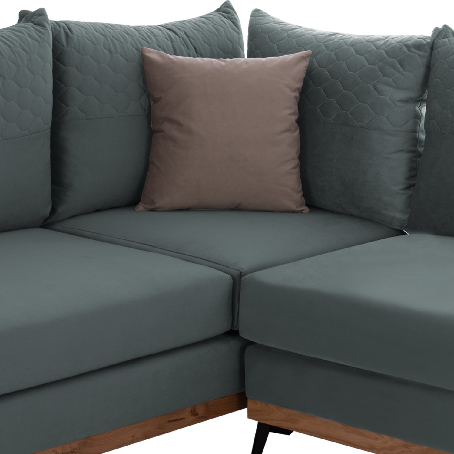 Ξεκινώντας από τα βασικά και τα προφανή, το χρώμα της βελούδινης επένδυσης του μεγάλου αυτού καναπέ είναι SAHARA 17- μέντα. Διαθέτει 5 μαξιλάρια πλάτης στο ίδιο χρώμα και δύο μικρότερα διακοσμητικά μαξιλάρια σε SAHARA 03- εκρού χρώμα. Τα 4 μαξιλάρια καθίσματος σε συνδυασμό με αυτά της πλάτης, δίνουν την τέλεια αίσθηση άνεσης! Τα μαξιλάρια πλάτης έχουν τεχνοτροπία καπιτονέ κατά το ήμισυ, όπως υπάρχει και μια πανέμορφη καπιτονέ λωρίδα στο μεγάλο μπράτσο. Το μεγάλο μαξιλάρι καθίσματος που σχηματίζει την γωνία δεν θα δυσκολέψει τον χρήστη φεύγοντας από την θέση του, επειδή διαθέτει «χρατς» και κολλάει στην ειδική επιφάνεια του σκελετού. Το κομμάτι που δημιουργεί την δεξιά γωνία, είναι κουμπωτό και συνδέεται με τον υπόλοιπο καναπέ αρμονικά με ενισχυμένους γαλβανιζέ αναρτήρες πάνελ (κατακόρυφα συρταρωτά) για τεράστια αντοχή και ευκολία στην χρήση.