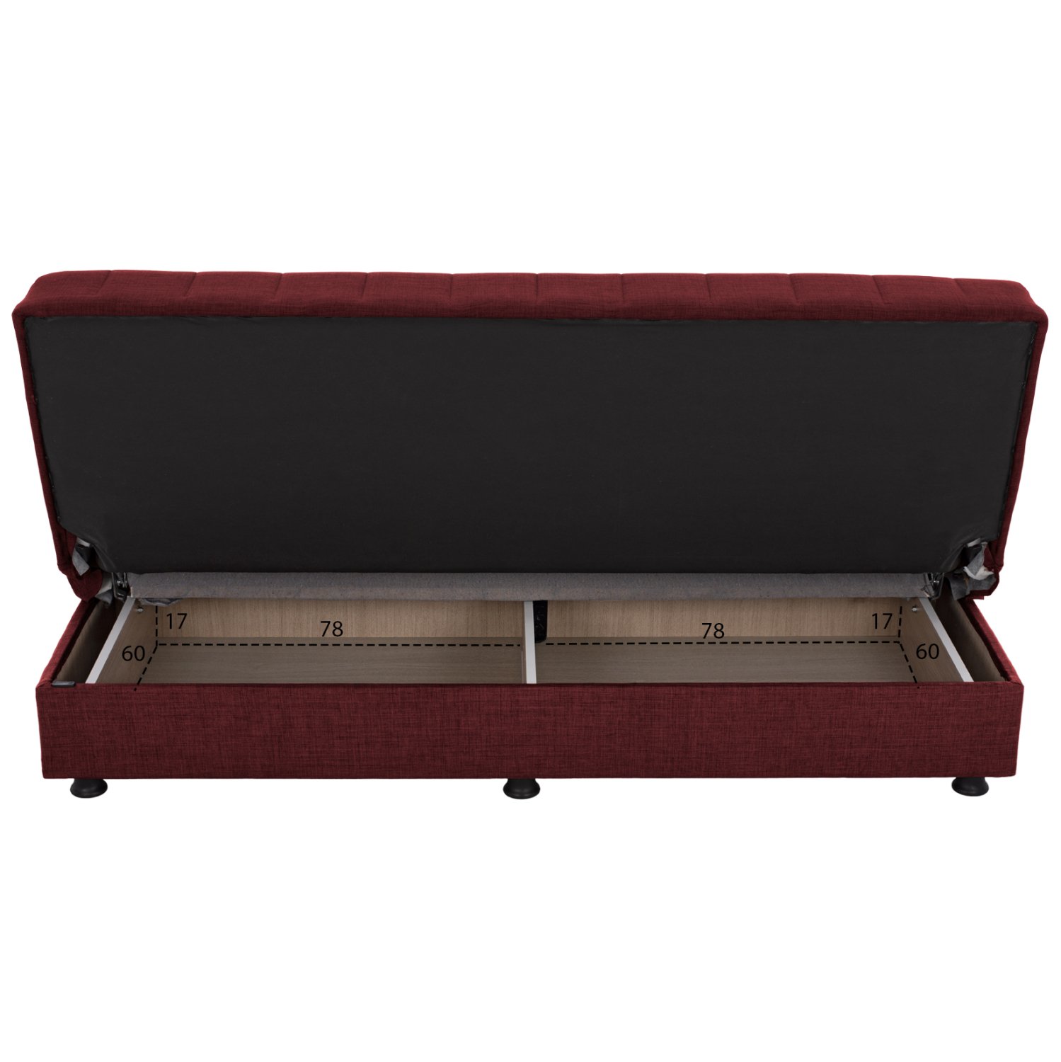Ξεκινώντας από τα βασικά και τα προφανή, το χρώμα της επένδυσης με το εξαιρετικό και καλοραμμένο ανάγλυφο ύφασμα αυτού του καναπέ, είναι κόκκινο. Διαθέτει 2 μικρά μακρόστενα μαξιλάρια με το ίδιο ύφασμα που μπορούν να χρησιμοποιηθούν όπως θέλει ο καθένας. Χαρακτηριστικό αυτού του καναπέ είναι ότι δεν διαθέτει μπράτσα με αποτέλεσμα να μην περιορίζει την χρήση του από τους χρήστες του. Επίσης, γίνεται πολύ εύκολα κρεβάτι μέσω ενός εύχρηστου μηχανισμού (κλικ-κλακ) πολλαπλασιάζοντας την χρησιμότητά του. Κάτω από το κάθισμα του καναπέ υπάρχουν 2 αποθηκευτικοί χώροι με ενισχυμένο πάτωμα καθιστώντας τον ένα πραγματικό πολυεργαλείο, ειδικά για φοιτητικά σπίτια αλλά και σπίτια με περιορισμένο γενικά χώρο.