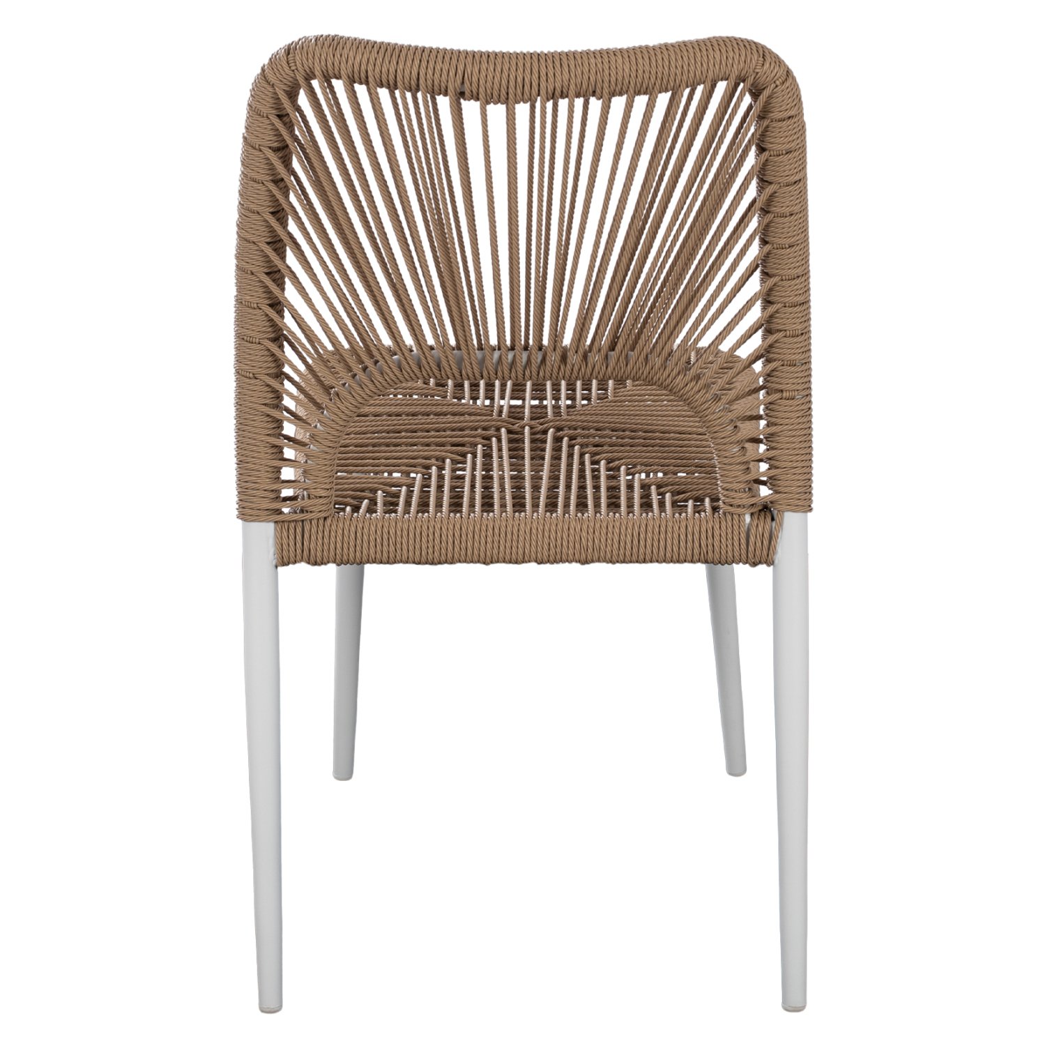 Μοντέρνα καρέκλα κατασκευασμένη από σκελετό αλουμινίου σε λευκή απόχρωση, επενδυμένη με πλεκτό ενισχυμένο PE σχοινί στο κάθισμα και στην πλάτη σε μπεζ απόχρωση.