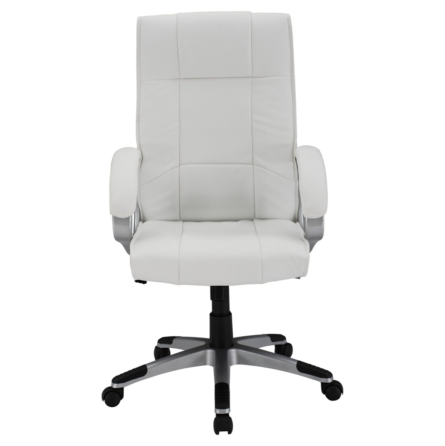 Διευθυντική καρέκλα γραφείου “CHANDER” σε λευκό χρώμα. Μια «πλούσια» καρέκλα γραφείου με ψηλά μπράτσα με κλίση και επενδυμένα με μια λεπτή στρώση αφρολέξ σε PU δέρμα. Η πλάτη είναι ψηλή με πλούσια στρώση από αφρώδη υλικά για άνεση κατά την χρήση και υποστηρίζει ολόκληρο τον κορμό σας, ενώ είναι επενδυμένη με υψηλής ποιότητας PU δέρμα , όπως επίσης και το φαρδύ και αναπαυτικό κάθισμα με την αναπαυτική επιφάνεια. Η βάση είναι ασημί σε σχήμα «αστέρι» με μαύρες λεπτομέρειες στο τελείωμα.