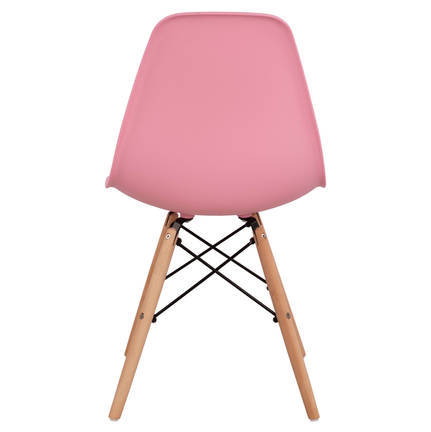 Μία μοντέρνα καρέκλα κατασκευασμένη από ξύλινο σκελετό και κάθισμα πολυπροπυλενίου σε ροζ απόχρωση.
