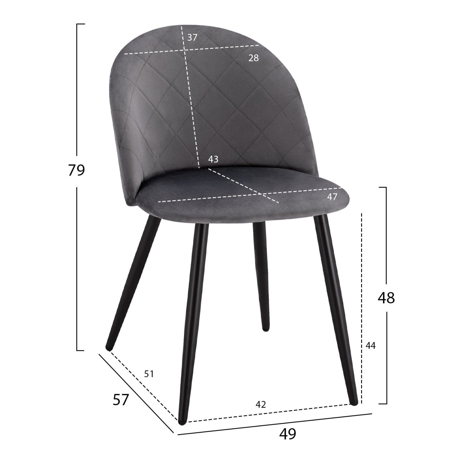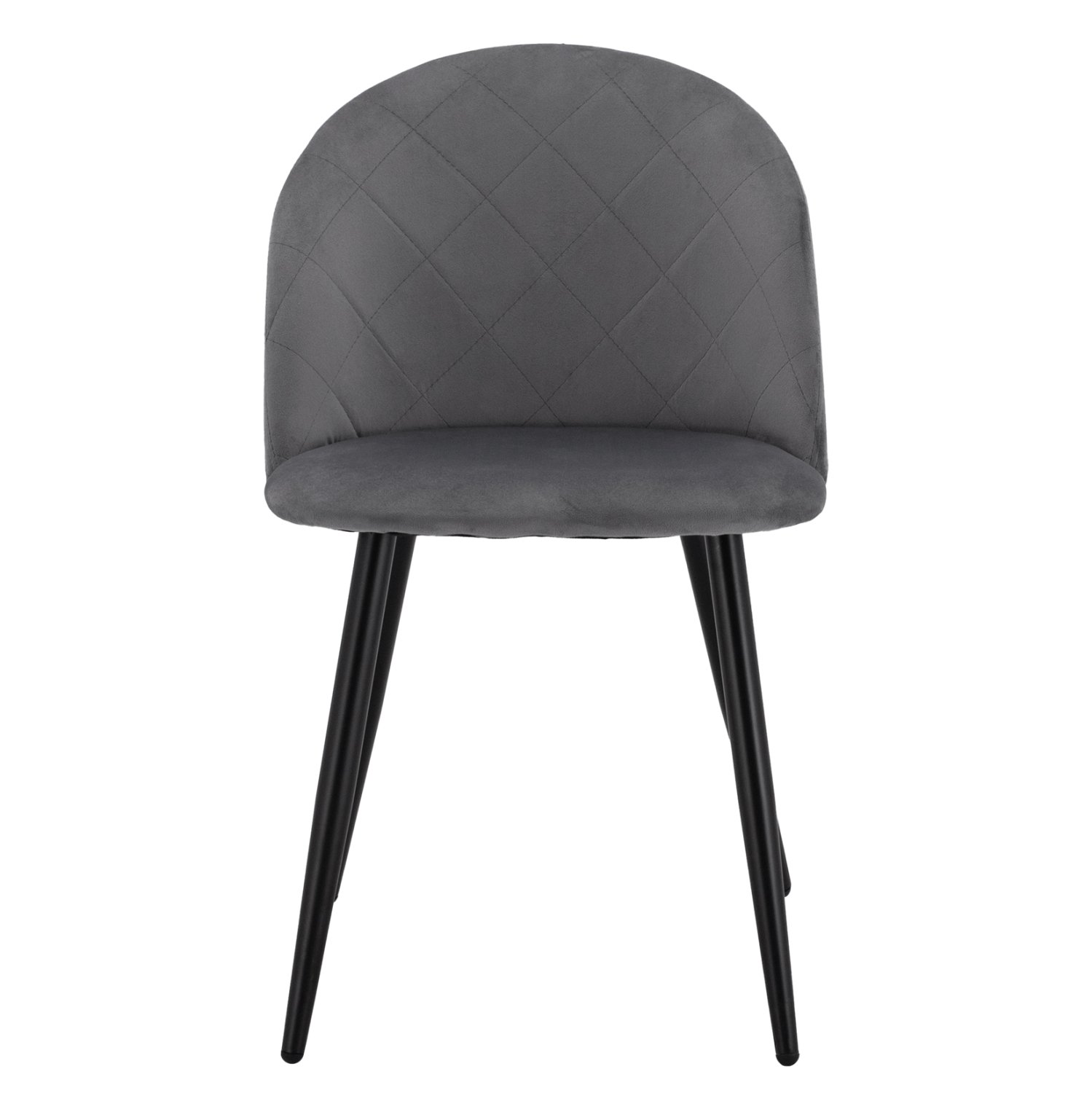 Καρέκλα επενδυμένη με ύφασμα βελούδο σε γκρι απόχρωση και μεταλλικό μαύρο σκελετό.