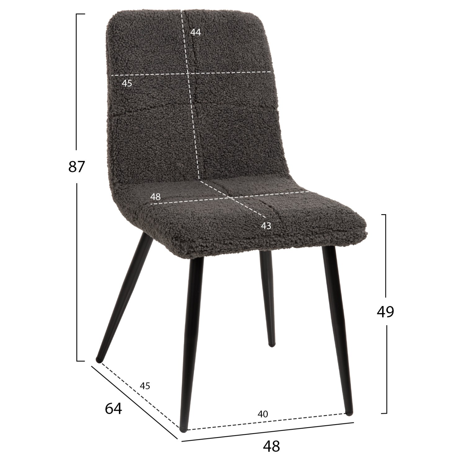 Η καρέκλα SHELLY είναι μοντέρνα, άνετη και σταθερή! Το κυρίαρχο χρώμα είναι το ΓΚΡΙ, ενώ τα 4 πόδια είναι σε μαύρο χρώμα. Η επένδυση της καρέκλας έχει γίνει με ξεχωριστό ύφασμα TEDDY που θα δώσει μια διαφορετική όψη στον χώρο σας. Πρόκειται για μια πρόταση λιτή, κυρίως για την τραπεζαρία σας, αλλά και που θα ταιριάξει σχεδόν παντού!