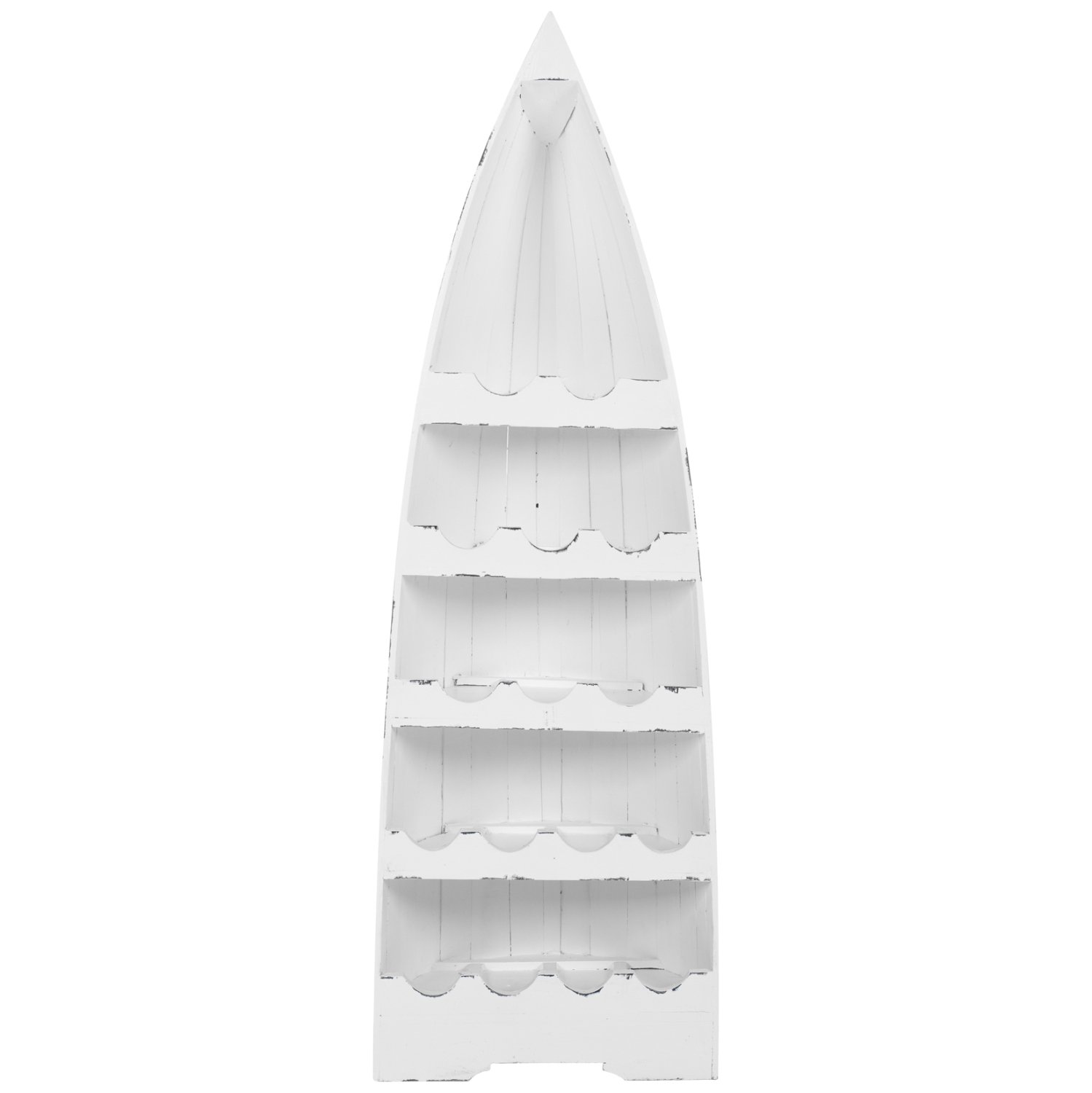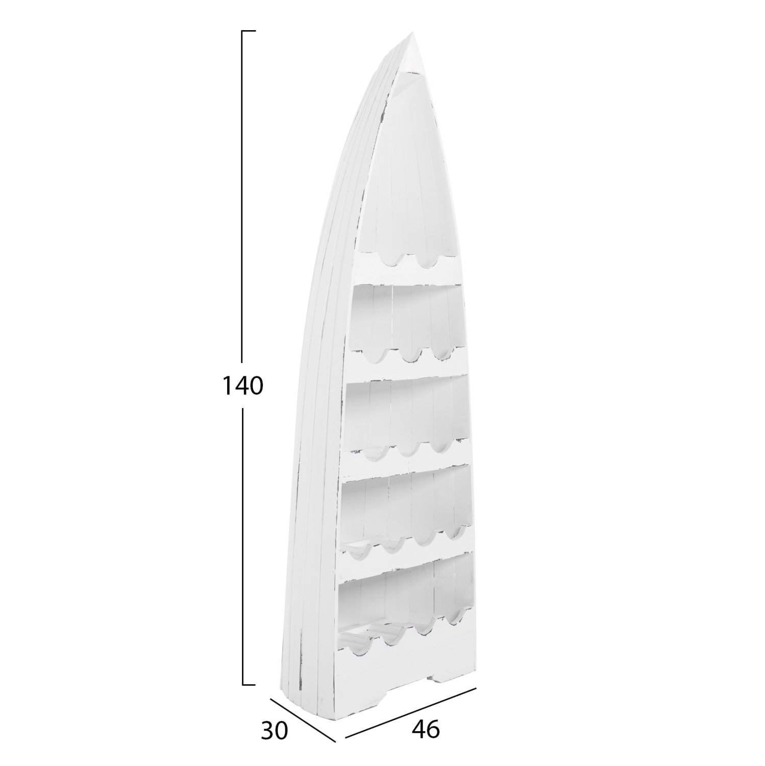Η ξύλινη κάβα μπουκαλιών ΗΜ9495 σε λευκό αντίκ χρώμα, είναι χρησιμότατη για κάθε χώρο. Είναι κατασκευασμένη σε σχήμα βάρκας κάθετα στερεωμένης, με λαξευμένες αριστοτεχνικά 5 σειρές για τοποθέτηση 17 μπουκαλιών. Πρόκειται για μια πανέμορφη κατασκευή που αποτελεί τόσο κομμάτι διακόσμησης, όσο και πρακτικό αντικείμενο οργάνωσης και αποθήκευσης μπουκαλιών.