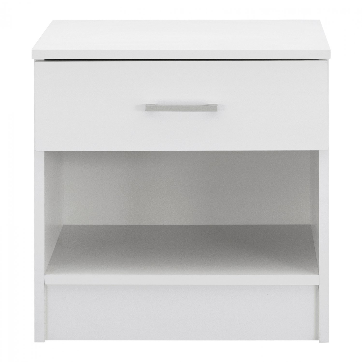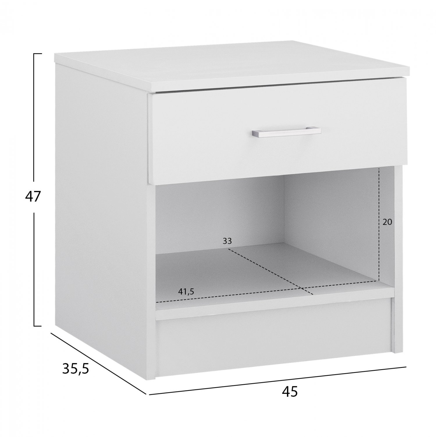 Κομοδίνο μελαμίνης με ένα συρτάρι σε λευκή απόχρωση.