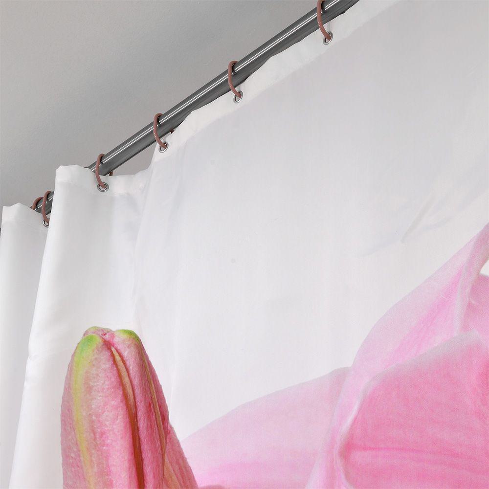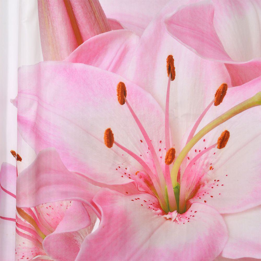 Κουρτίνα μπάνιου από τη νέα Bath Collection της εταιρείας Lino Home. Η κουρτίνα είναι σχεδιασμένη με απόλυτο και κομψό ύφος καθώς είναι διακοσμημένη ένα δροσερό ροζ λίλιουμ. Η νέα συλλογή σε κουρτίνες μπάνιου, παρουσιάζει την ιδιαιτερότητα να έχει κρίκους χρωματικά ταιριαστούς με την κουρτίνα. Η νέα μας συλλογή σε κουρτίνες μπάνιου, είναι κατασκευασμένες από 100% αδιάβροχο πολυεστερικό ύφασμα προκειμένου και να στέκεται όμορφα κρεμασμένη στο χώρο αλλά και να προστατεύει το χώρο από τυχόν νερά που πετάγονται κατά τη διάρκεια του μπάνιου.