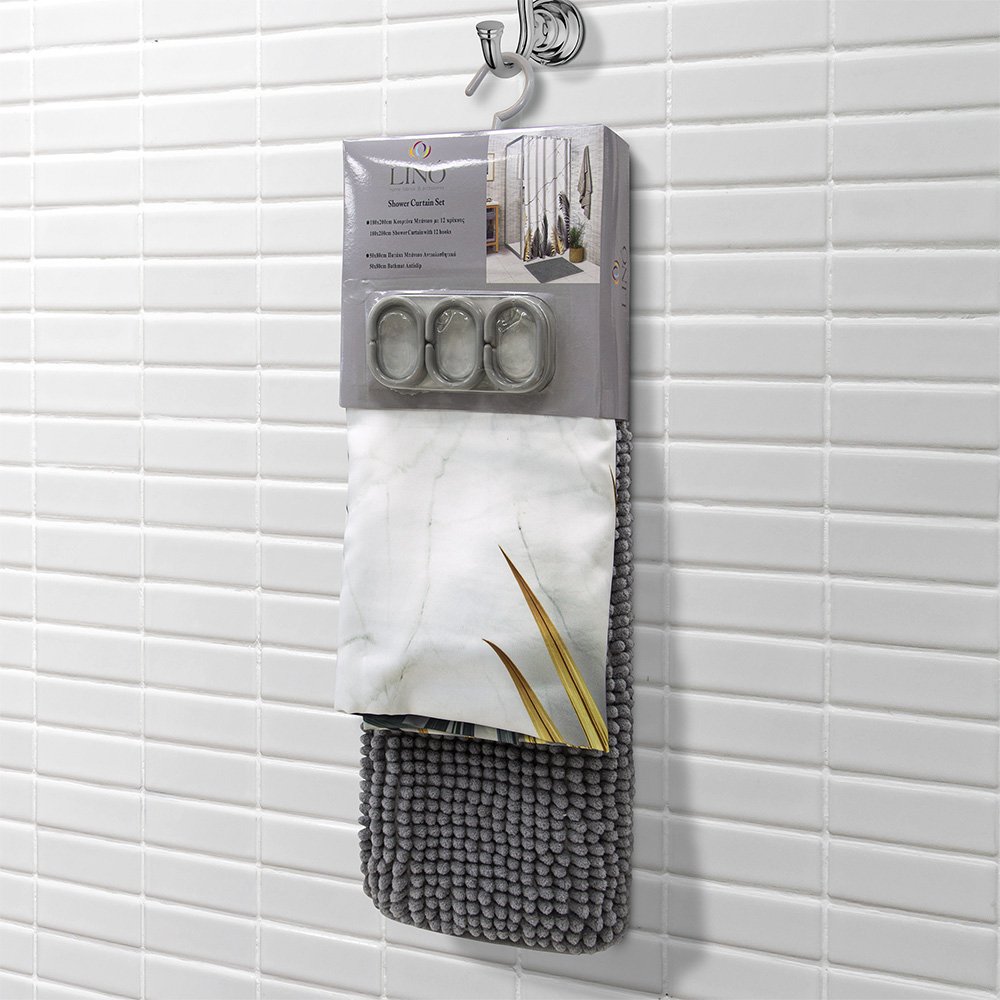 Περιλαμβάνει μία κουρτίνα μπάνιου με δώδεκα πλαστικούς κρίκους