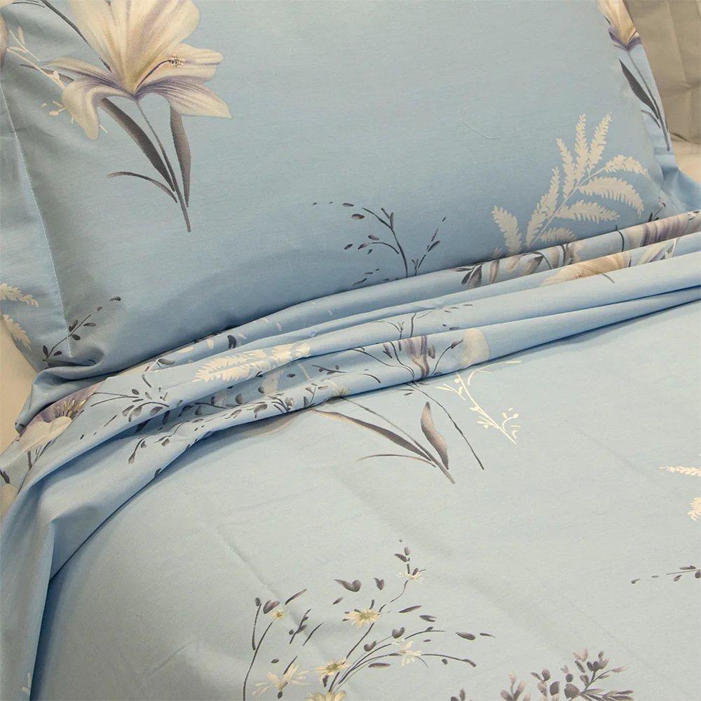 Σετ σεντόνια Floria της εταιρείας Lino Home! To σεντόνι Floria διαθέτει υπέροχο floral μοτίβο σε απαλές και ψυχρές σιέλ αποχρώσεις. Το design λουλουδιών προσδίδει μία ρομαντική και κομψή ατμόσφαιρα στο υπνοδωμάτιο.To σεντόνι Floria είναι ένα αριστούργημα από κατασκευαστικής άποψης, καθώς διαθέτει 220 κλωστές ανα ίντσα, το οποίο καθιστά το σεντόνι πολύ πυκνό και ιδιαίτερα απαλό και ανθεκτικό με satine φινίρισμα. Oι λείες υφές του προσφέρουν άνεση και πολυτέλεια στον ύπνο αλλά και η χαρακτηριστική ραφή oxford στις μαξιλαροθήκες προσδίδει ένα elegant στοιχείο στη διακόσμηση του χώρου σας.