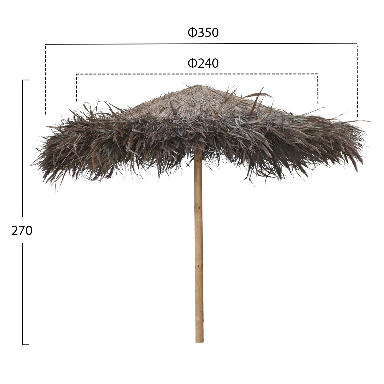 Η ομπρέλα είναι ψάθινη ενώ ο στύλος της ομπρέλας είναι από «άγριο» ξύλο πεύκου, εμποτισμένο και τορναρισμένο.
