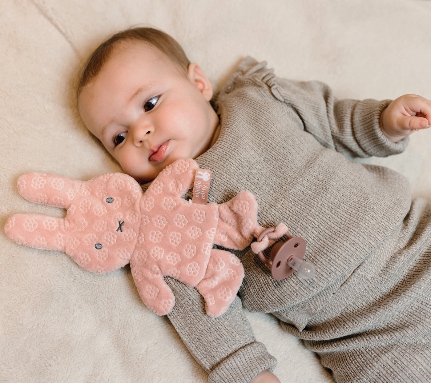Ένα υπέροχα μαλακό βελουτέ πανάκι παρηγοριάς από τη νέα σειρά της Miffy, Miffy Flowers. Είναι εξαιρετικό για τρυφερές αγκαλιές και έχει ένα διακοσμητικό λουράκι με το οποίο τα μικρά παιδιά μπορούν να παίξουν, στο οποίο μπορείτε και να κρεμάσετε και τις πιπίλες σας.