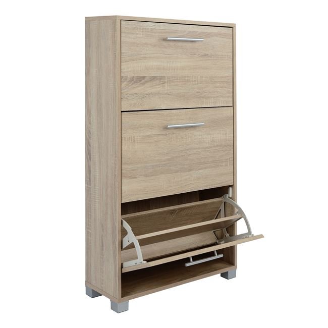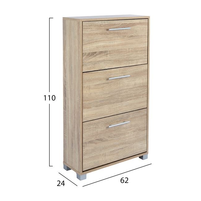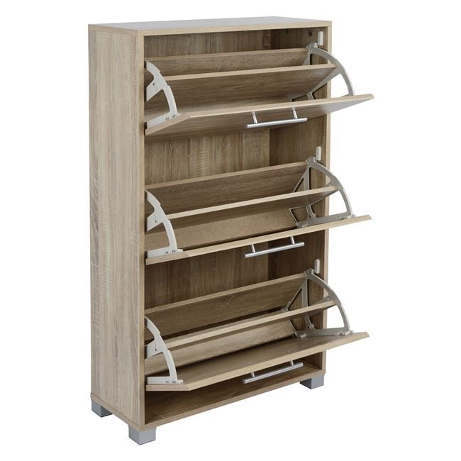 Παπουτσοθήκη από μελαμίνη άριστης ποιότητας, με 3 ανακλινόμενα ντουλάπια που χωράνε 18-21 ζευγάρια παπούτσια.