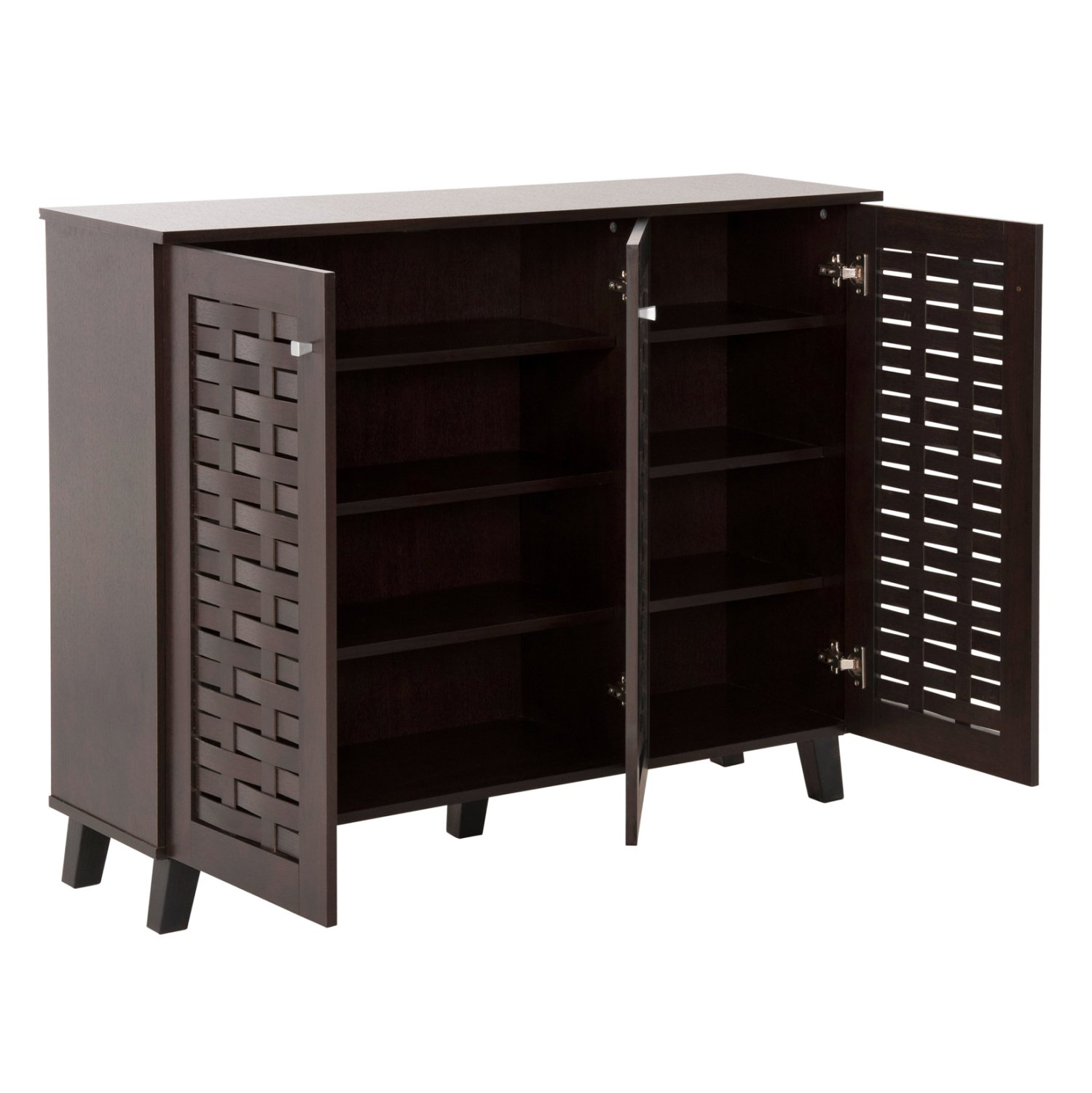 Σας παρουσιάζουμε την παπουτσοθήκη-ντουλάπι μελαμίνης PRODY σε WENGE χρώμα. Πρόκειται για ένα ντουλάπι με 2 ξεχωριστούς χώρους με 4 ράφια αποθήκευσης, και κλείνει με 3 πόρτες με μεταλλικά κυβάκια χερούλια. Μια διπλή πόρτα για τον μεγαλύτερο χώρο, και μια μονή πόρτα για τον μικρότερο χώρο. Το χαρακτηριστικό είναι ότι το κάθε επίπεδο και στους δύο χώρους, έχει διαφορετικό ύψος για να σας βοηθάει να τακτοποιείτε τα παπούτσια σας ανάλογα με το ύψος τους. Σκοπός μας είναι να σας βοηθήσουμε να οργανώσετε και να βελτιώσετε με τον καλύτερο δυνατό τρόπο οτιδήποτε θελήσετε.