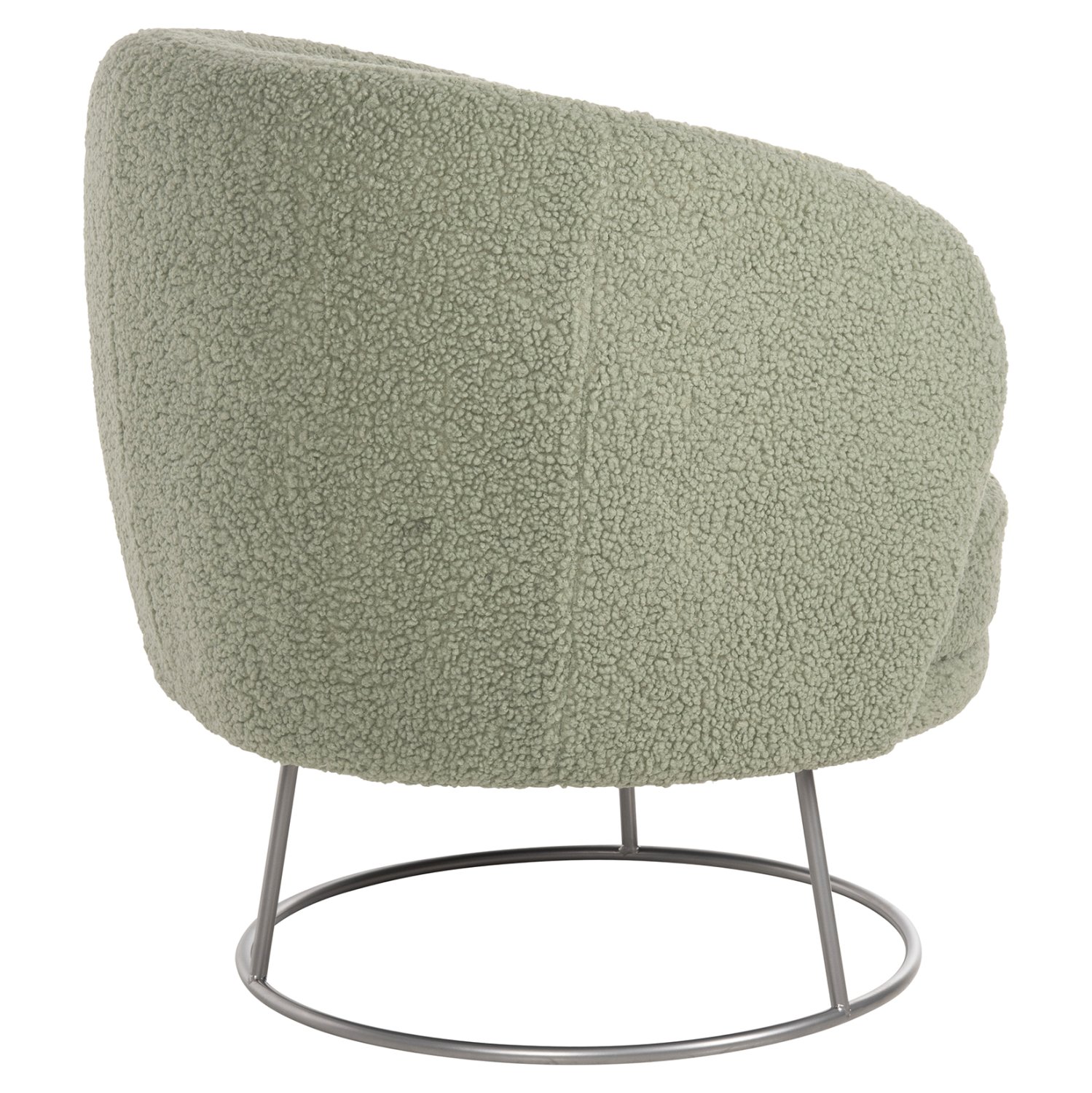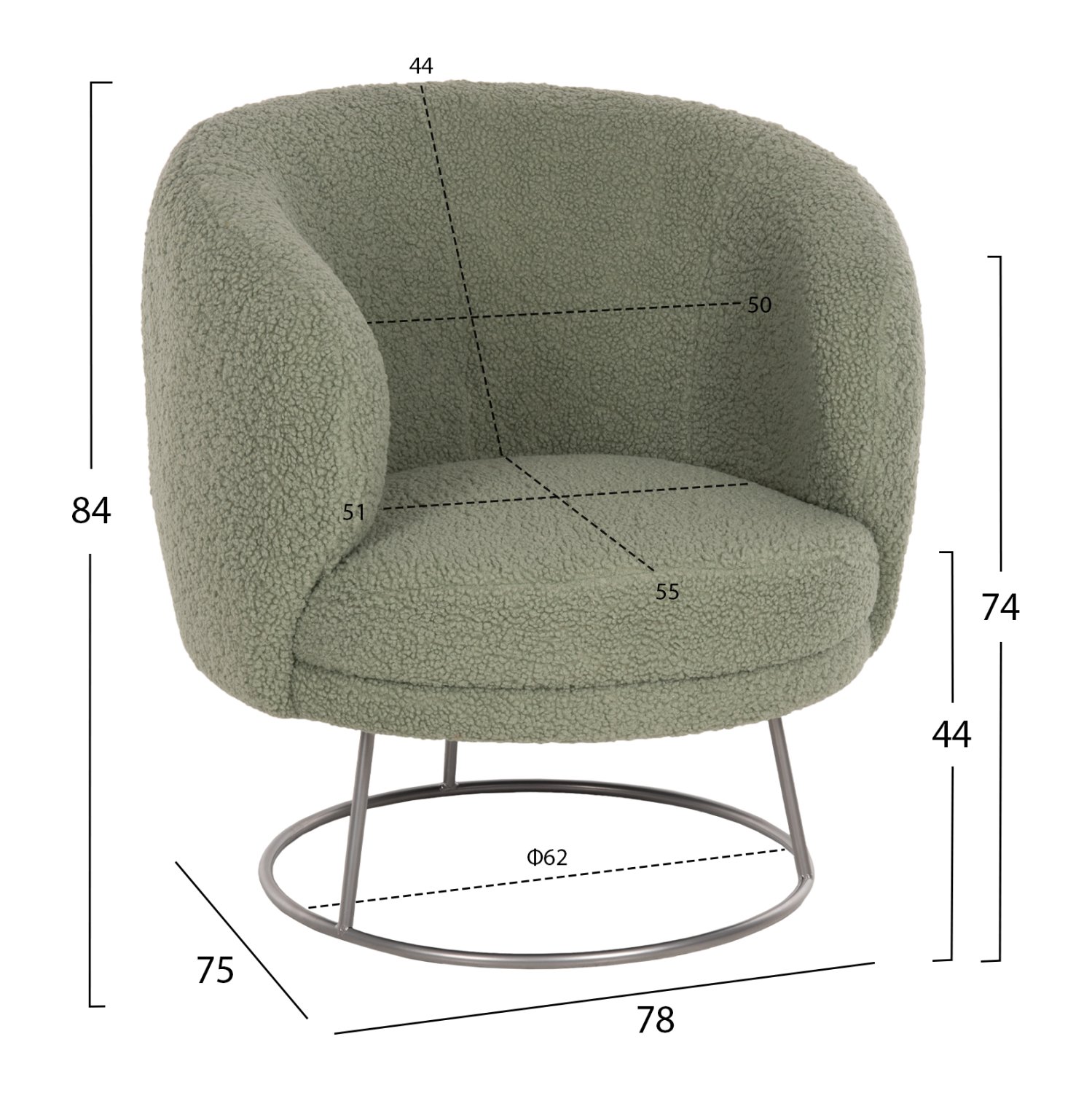 Η επένδυση της πολυθρόνας έχει γίνει εξολοκλήρου με εξαιρετικής ποιότητας μπουκλέ ύφασμα. Μπουκλέ λέγεται οποιοδήποτε ύφασμα που έχει κόμπο-μπούκλα στην ύφανσή του. Κατασκευάζεται από σχεδόν όλες τις πρώτες ύλες (αν και συνήθως είναι συνθετικό) με ειδικές κλωστές με κόμπους ή πολύ στριμμένα νήματα, έτσι ώστε να έχει σγουρή επιφάνεια. Δεν τσαλακώνει και μπορεί να είναι μονόχρωμο, μελανζέ ,καρώ ή τουιντ.