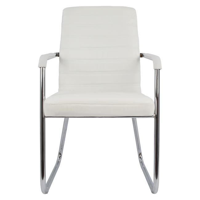 Κάντε τους επισκέπτες ή τους συνεργάτες σας να αισθανθούν άνετα με την καρέκλα DALEY. Πρόκειται για μια πολυθρόνα γραφείου συνεργασίας σε λευκό χρώμα και λιτό σχεδιασμό αλλά σίγουρα όμορφο. Είναι χρωμιωμένη ενώ το κάθισμα και η πλάτη είναι ενωμένα. Τα μπράτσα είναι επίπεδα και αποτελούν συνέχεια του σκελετού βάσης δημιουργώντας μια πανέμορφη εικόνα, ενώ η επένδυσή της είναι ριγέ PU, τόσο στο κάθισμα, όσο και στην πλάτη. Ο σκελετός της καρέκλας έχει όμορφες καμπύλες ενώ τα μπράτσα έχουν επένδυση πολυκαρβονική για πιο ευχάριστη υφή.