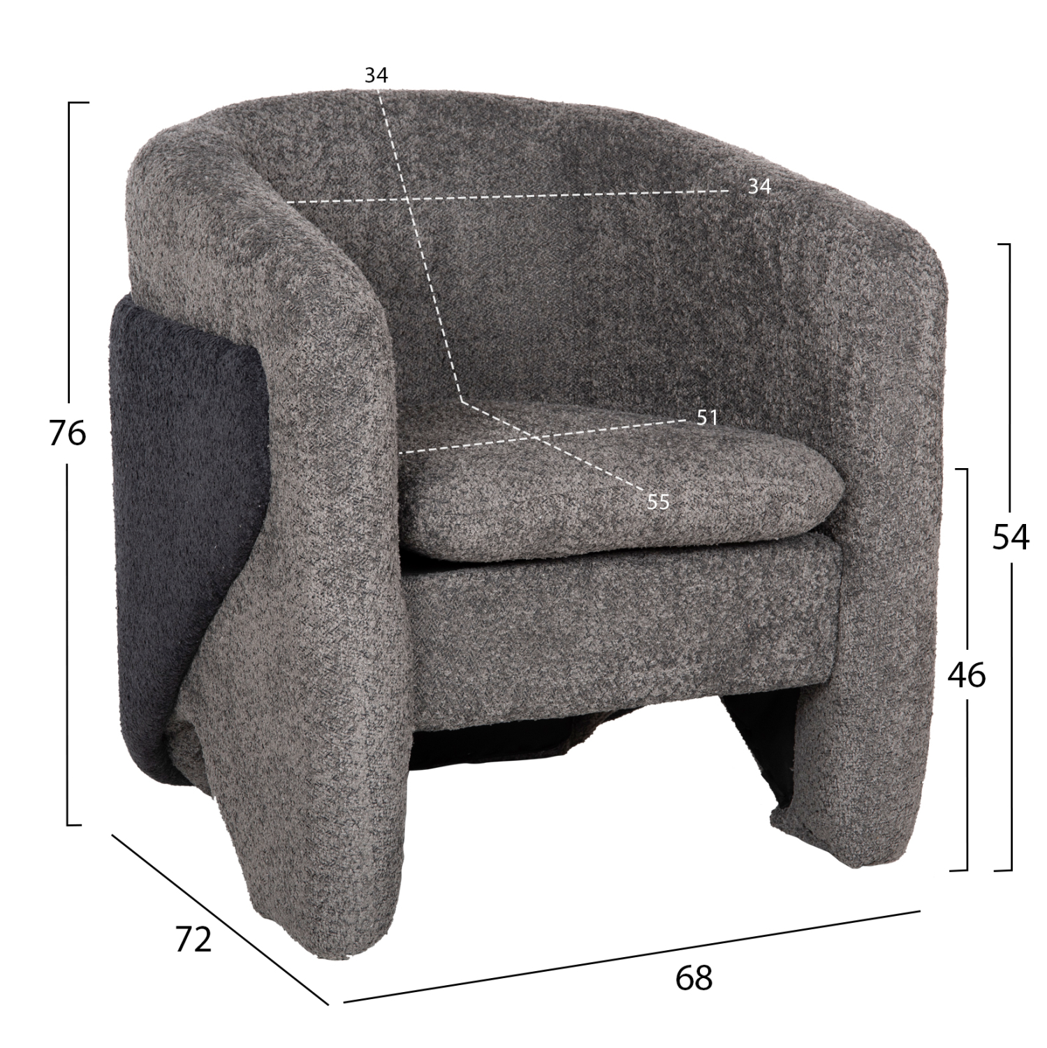 Ολόκληρη η επένδυση της πολυθρόνας έχει γίνει με εξαιρετικής ποιότητας ΜΠΟΥΚΛΕ ύφασμα. Μπουκλέ λέγεται οποιοδήποτε ύφασμα που έχει κόμπο-μπούκλα στην ύφανσή του. Κατασκευάζεται από σχεδόν όλες τις πρώτες ύλες (αν και συνήθως είναι συνθετικό) με ειδικές κλωστές με κόμπους ή πολύ στριμμένα νήματα, έτσι ώστε να έχει σγουρή επιφάνεια. Δεν τσαλακώνει και μπορεί να είναι μονόχρωμο, μελανζέ ,καρώ ή τουιντ.