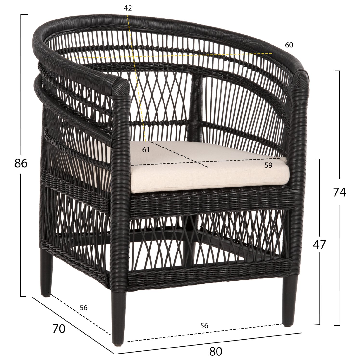 Η πολυθρόνα MALAWI είναι πανέμορφη! Μοντέρνα, άνετη και σταθερή με κυρίαρχο χρώμα το ΜΑΥΡΟ. Το ημικυκλικό κάθισμα της πολυθρόνας είναι άνετο και διαθέτει ΛΕΥΚΟ μαξιλάρι μέτριας σκληρότητας ενώ η πολυθρόνα δίνει την αίσθηση ότι αγκαλιάζει το σώμα. Αυτό όμως που τραβάει τα βλέμματα σε αυτή την πολυθρόνα είναι ότι η πλάτη με τα μπράτσα αποτελούν μια συνεχόμενη κατασκευή με επένδυση από RATTAN που δίνει μια αίσθηση μοναδικότητας στην πολυθρόνα!