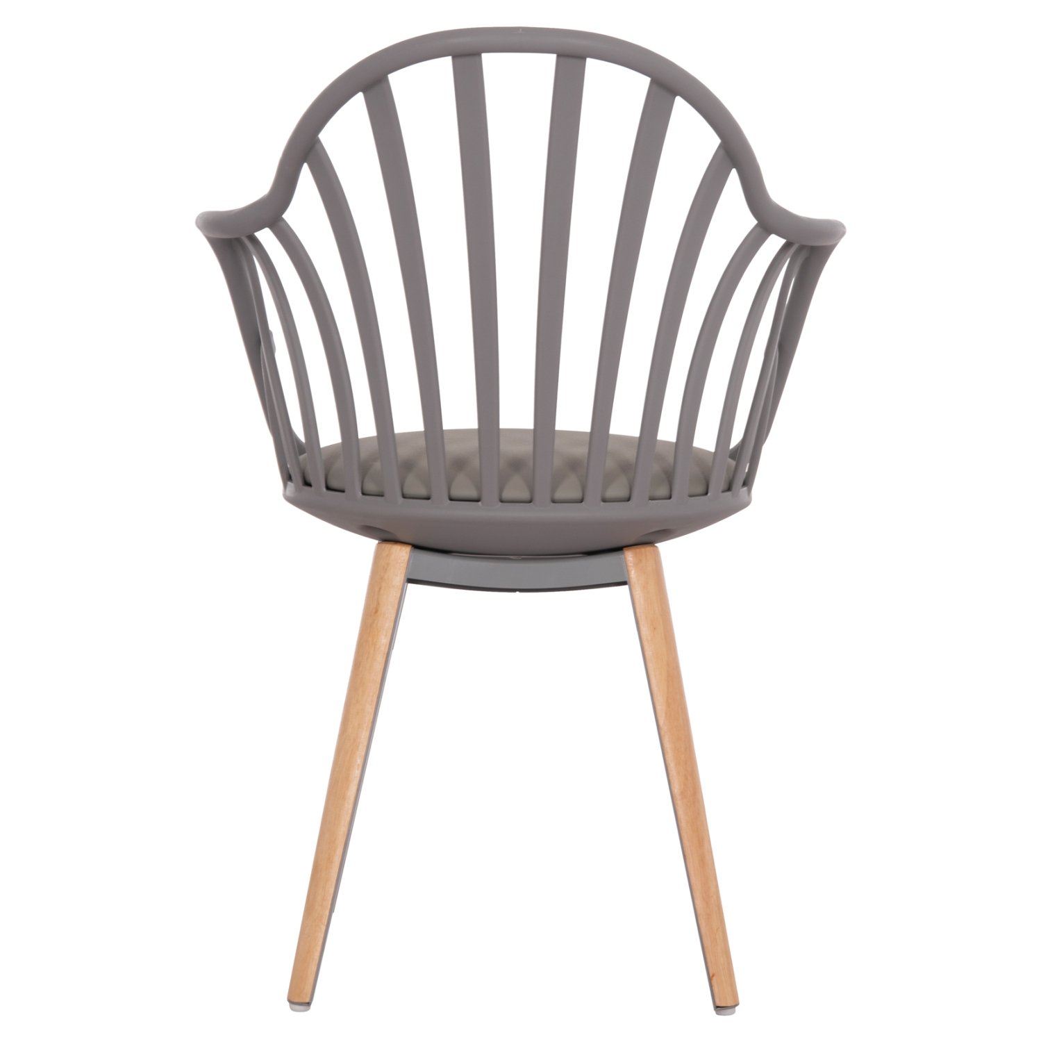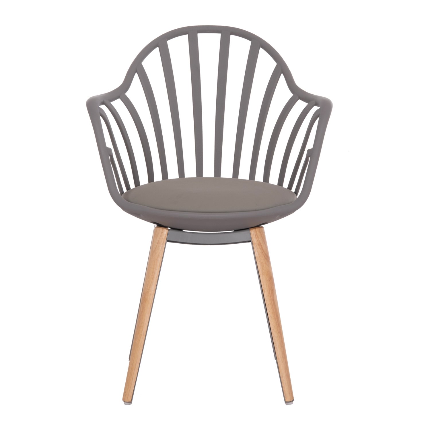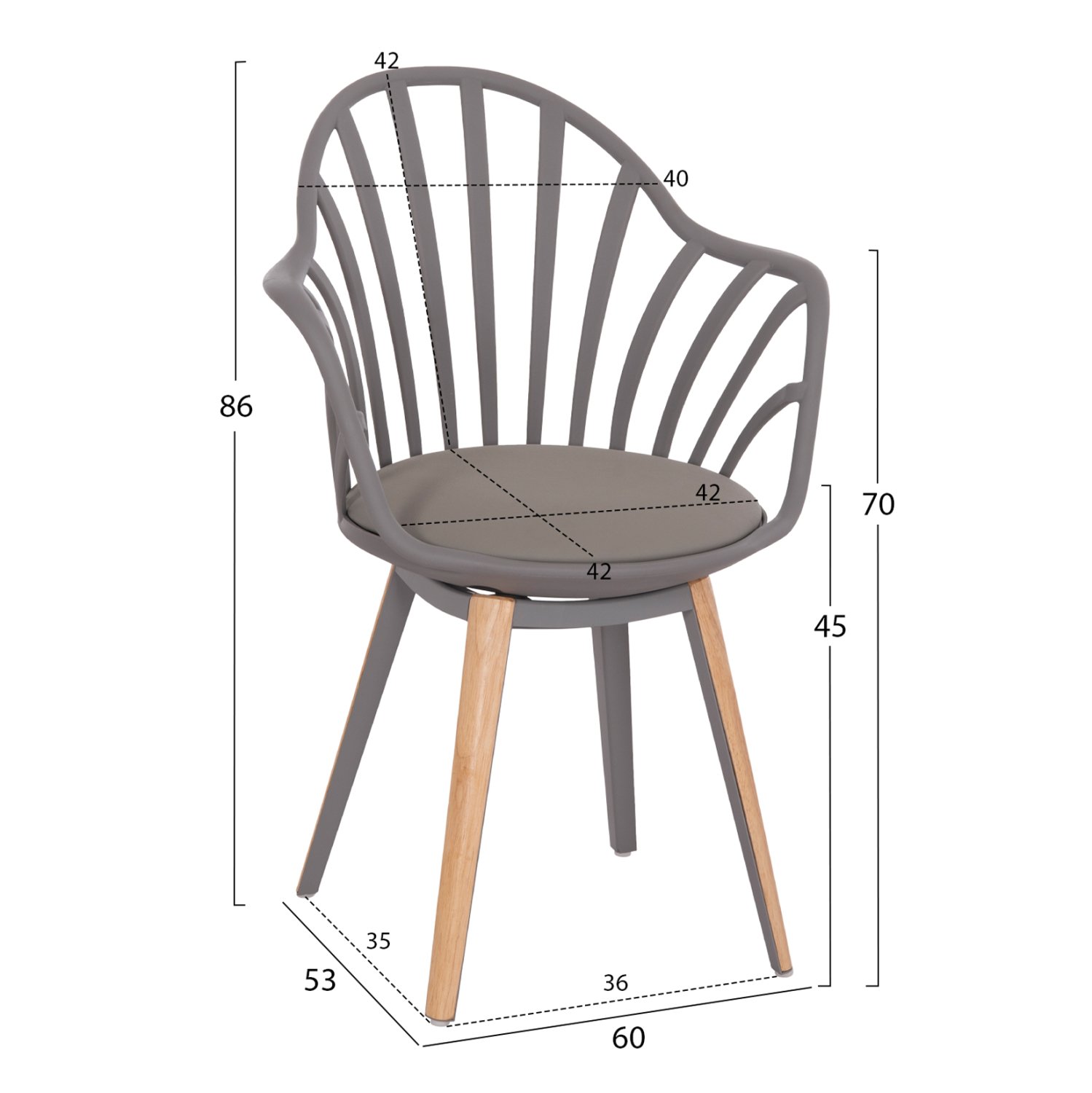 Πολυθρόνα τραπεζαρίας ANAIS, από πολυπροπυλένιο και κάθισμα από PU σε γκρι χρώμα, πόδια εσωτερικά από γκρι μεταλλικό σκελετό και εξωτερικά ντυμένα με ξύλινη επένδυση σε φυσική απόχρωση του ξύλου.