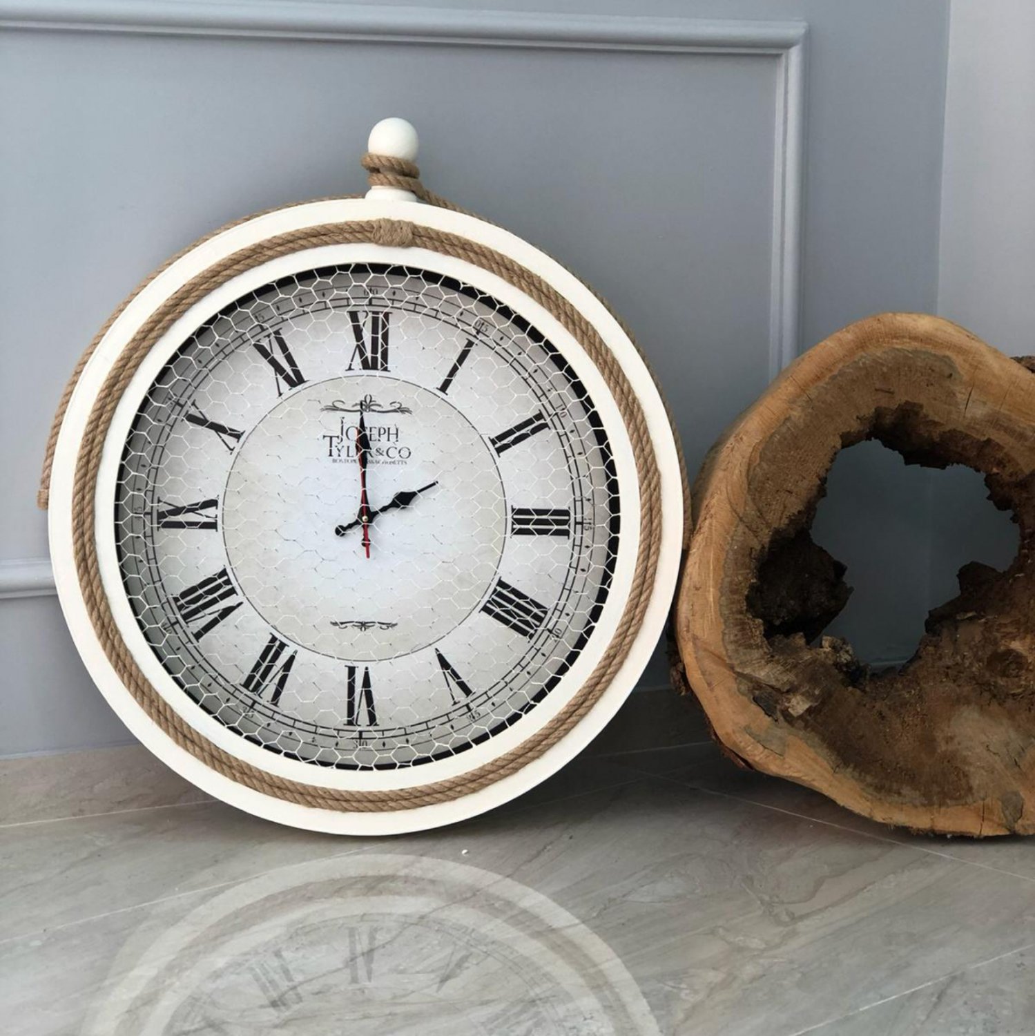 Ρολόι τοίχου σε λευκή απόχρωση με σχοινί και μεταλλικό πλέγμα.