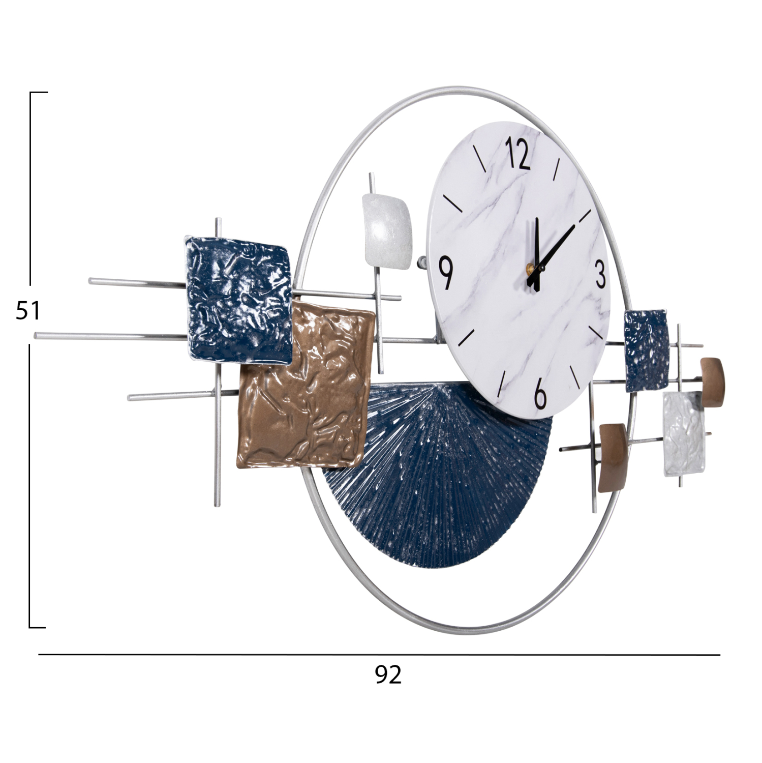 Μια όμορφη και απαραίτητη αισθητική αλλά και χρηστική προσθήκη για κάθε δωμάτιο του σπιτιού ή της επιχείρησής σας. Ένα ρολόι τοίχου είναι μια κλασική διακοσμητική ιδέα που ποτέ δεν θα παλιώσει. Το HΜ4209 μεταλλικό διακοσμητικό ρολόι σε ΛΕΥΚΟ χρώμα με μαύρους δείκτες και αριθμούς και με διάφορα σχήματα σε ΜΠΛΕ και ΚΑΦΕ χρώμα, αποτελεί μια σικάτη και ελκυστική πρόταση για οποιονδήποτε χώρο, που θα εντυπωσιάσει.