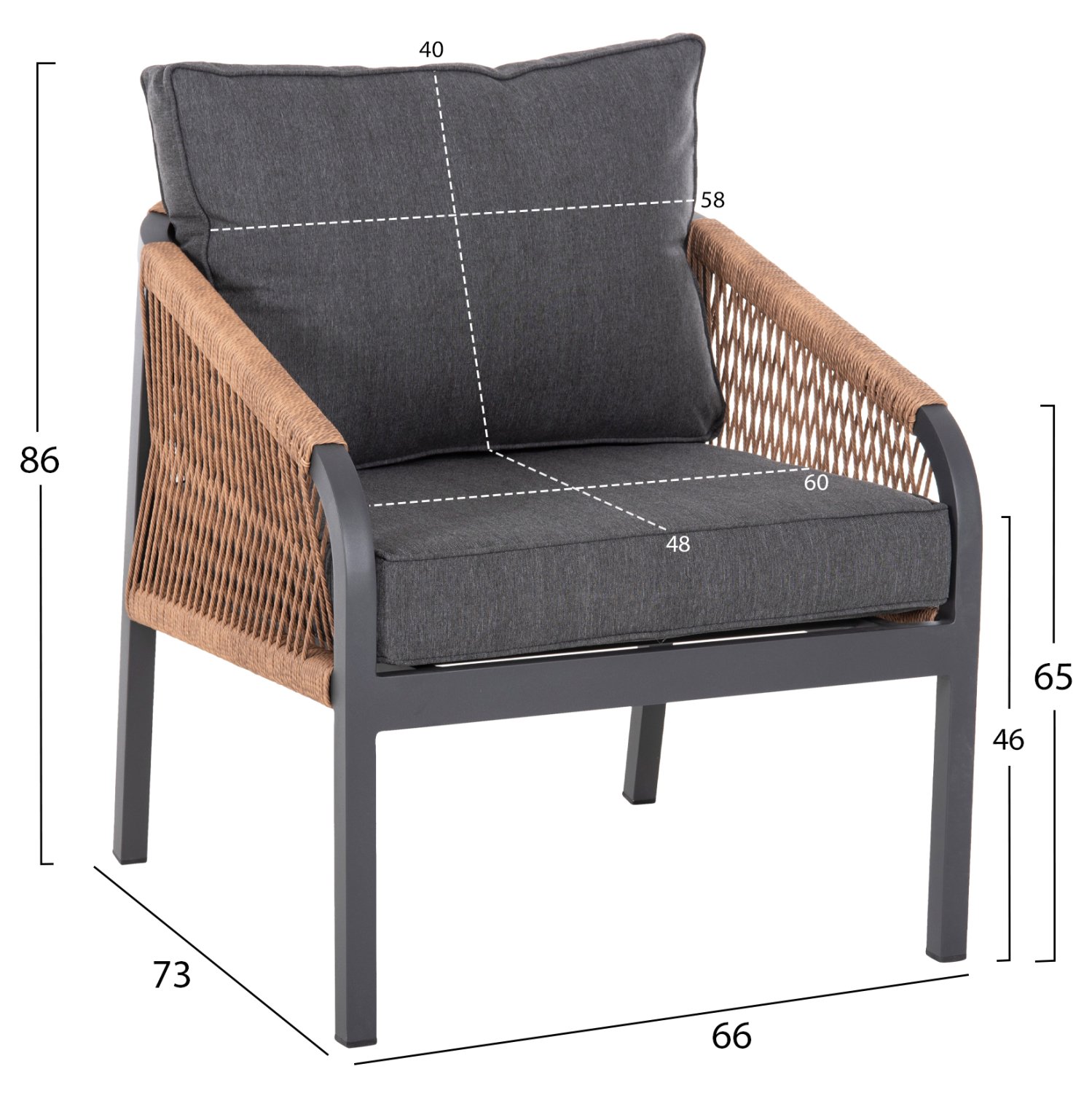 Σας παρουσιάζουμε το εντυπωσιακό και νέο σετ σαλονιού εξωτερικού χώρου MAERLY σε ΑΝΘΡΑΚΙ χρώμα, με τραπεζάκι, 2 πολυθρόνες και 1 τριθέσιο καναπέ. Ένα σετ που θα το λατρέψετε με την πρώτη ματιά. Ο σκελετός σε όλο το σετ είναι από αλουμίνιο επενδυμένο με ΜΠΕΖ συνθετικό σχοινί. Το design τους είναι πανέμορφο στην όψη ενώ η στιβαρότητά τους είναι εμφανής. Το κάθισμά στον καναπέ και τις πολυθρόνες είναι φαρδύ ενώ η πλάτη τους αγκαλιάζει το σώμα πράγμα που επιτείνει την άνεση που προσφέρουν, σε συνδυασμό με τα αναπαυτικά μαξιλάρια τόσο στο κάθισμα όσο και στην πλάτη. Ο τριθέσιος καναπές σε παρόμοιο design είναι, όμως, το πιο εντυπωσιακό κομμάτι αυτού του σετ με τις μεγάλες διαστάσεις του που τον καθιστούν το σημείο αναφοράς. Τα μαξιλάρια σε όλο το σετ είναι επενδυμένα με πολυεστερικό ύφασμα σε ΑΝΘΡΑΚΙ χρώμα και διαθέτουν γέμισμα με μέτριας σκληρότητας αφρώδη υλικά για την μεγαλύτερη δυνατή άνεση, αλλά και φερμουάρ. Τι άλλο να ζητήσει κανείς για να αναβαθμίσει τον εξωτερικό χώρο της επιχείρησής του;