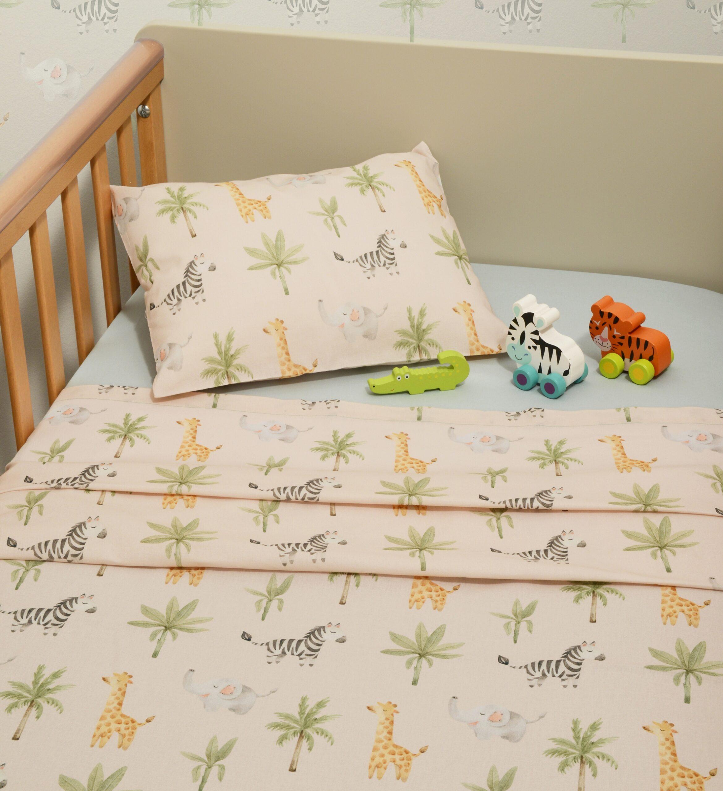 Σετ πανωσέντονο, κατωσέντονο και μαξιλαροθήκη για κούνια, από ύφασμα με πιστοποίηση Oekotex, σε πολύχρωμα σχέδια.