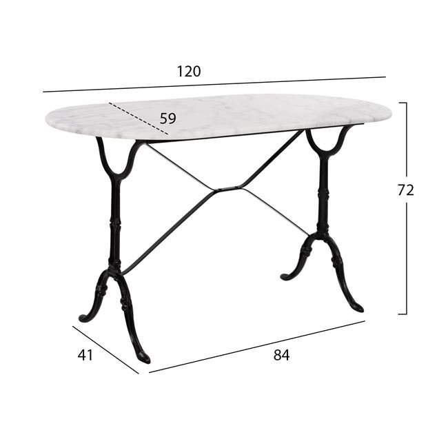 Ένα τραπέζι με οβάλ μαρμάρινη επιφάνεια σε λευκή απόχρωση και σκελετό από μαντέμι σε μαύρη απόχρωση.