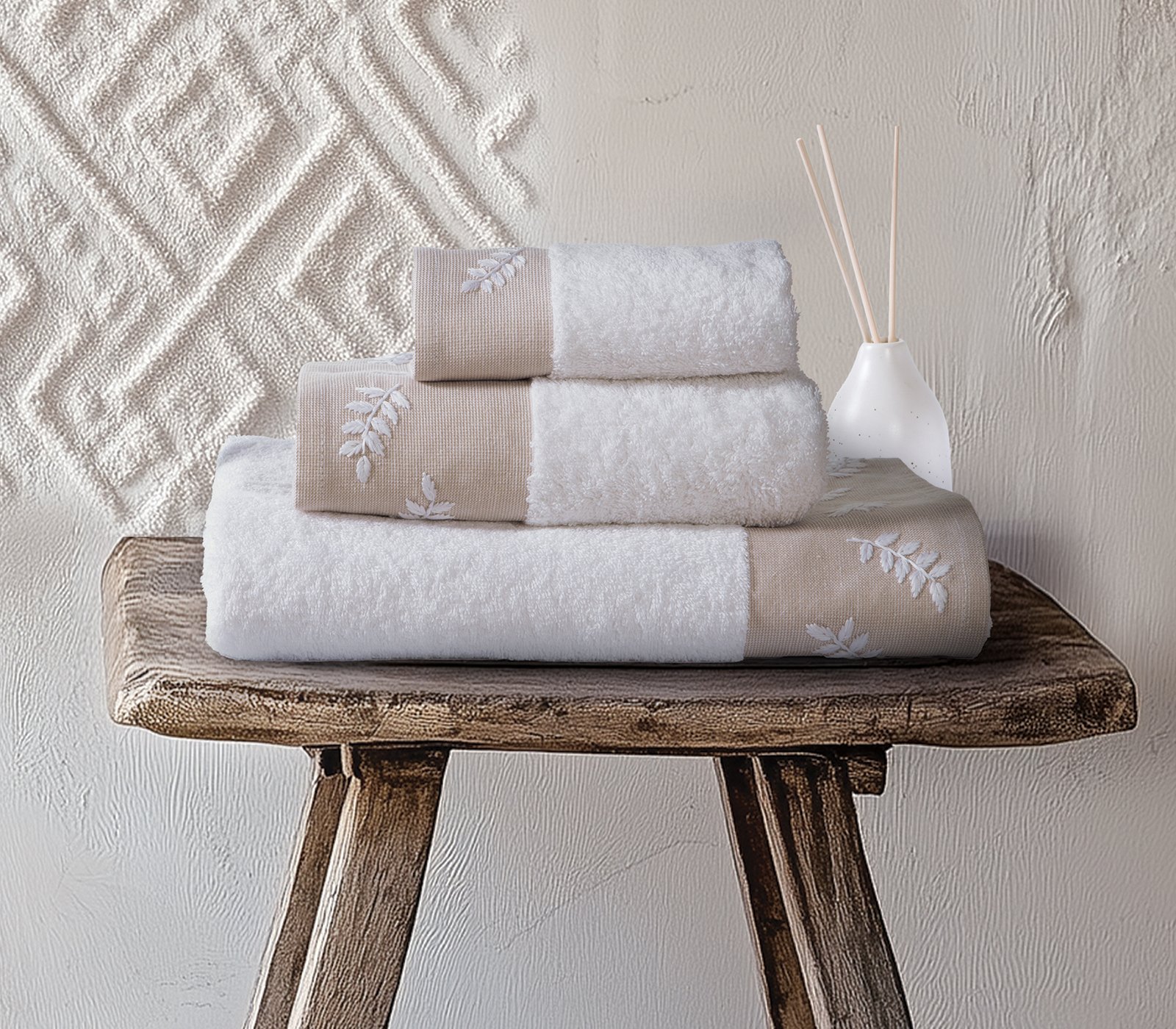 Το σετ περιλαμβάνει μια πετσέτα χεριών 30x50cm, μια πετσέτα προσώπου 50x90cm και μια πετσέτα μπάνιου 70x140cm.