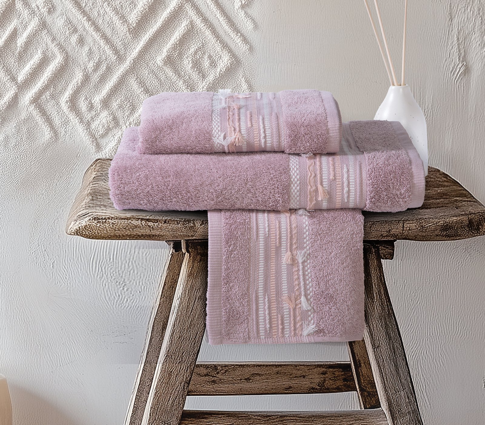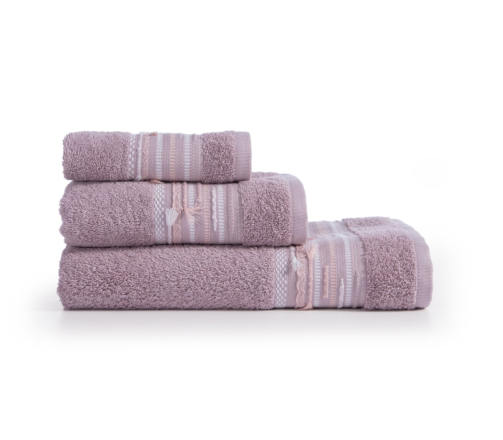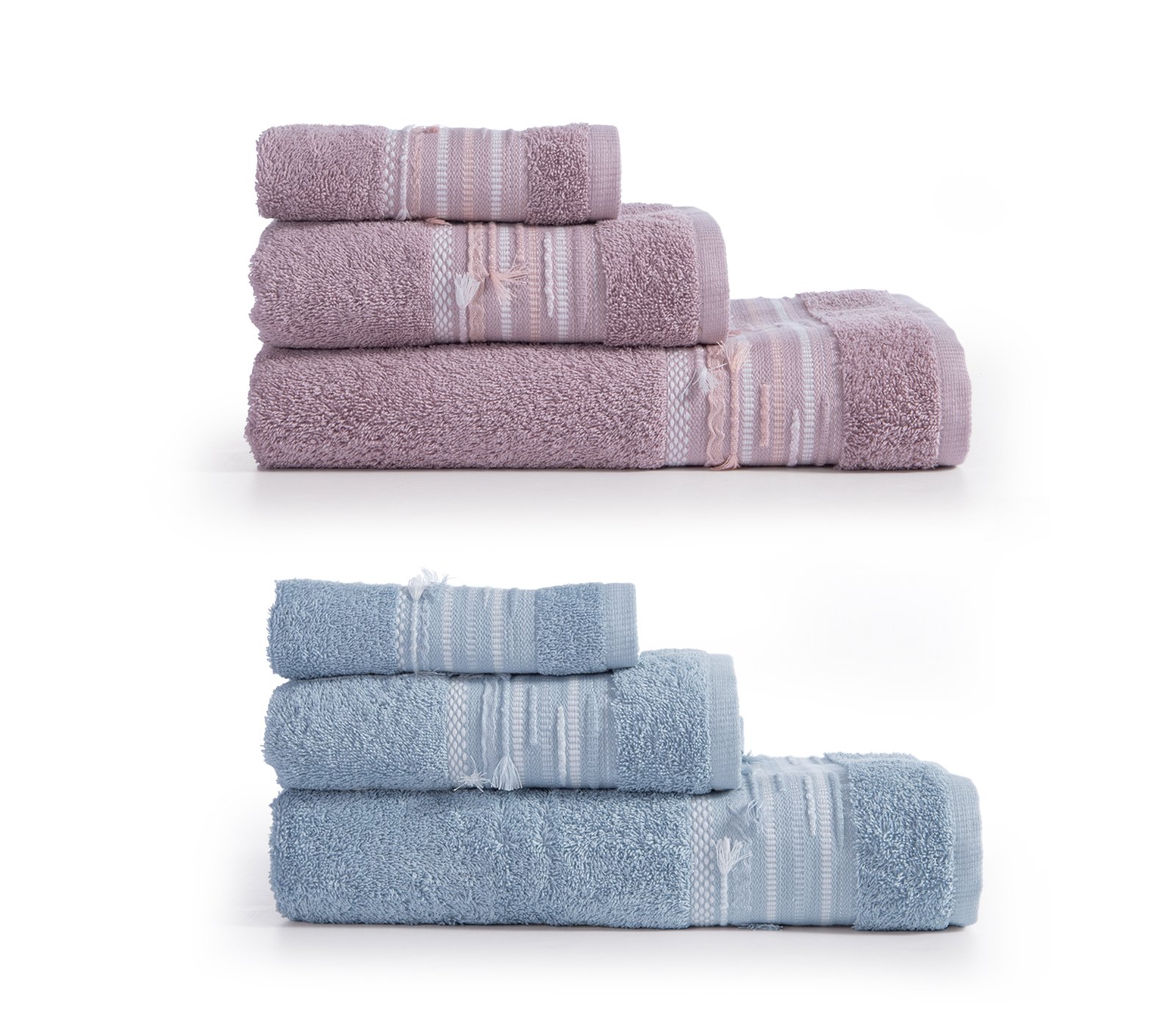 Το σετ περιλαμβάνει μια πετσέτα χεριών 30x50cm, μια πετσέτα προσώπου 50x90cm και μια πετσέτα μπάνιου 70x140cm.