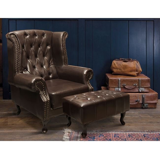 Σετ πολυθρόνα μπερζέρα και υποπόδιο, τύπου chesterfield καπιτονέ απο σκούρο καφέ τεχνόδερμα υψηλής ποιότητας και ενισχυμένο ξύλινο σκελετό στο εσωτερικό του και στα πόδια .