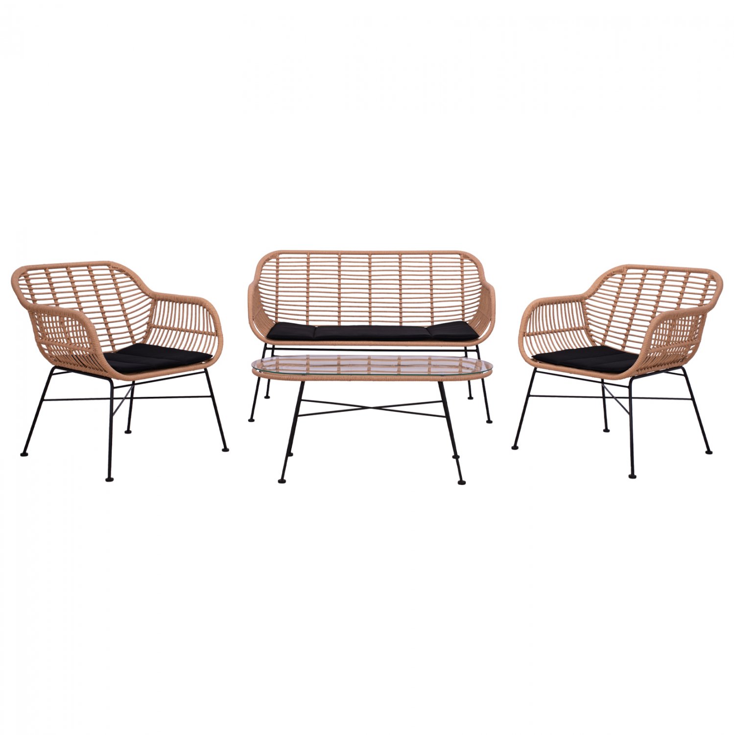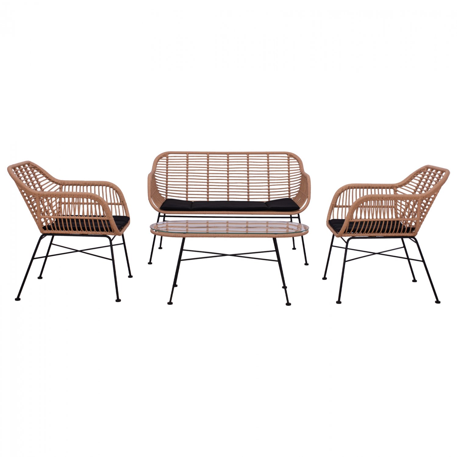 Ολοκληρωμένο σαλόνι 4 τμχ. από μεταλλικό σκελετό σε μαύρη απόχρωση, με επένδυση wicker σε μπεζ απόχρωση και υφασμάτινα μαξιλάρια σε μαύρο χρώμα.